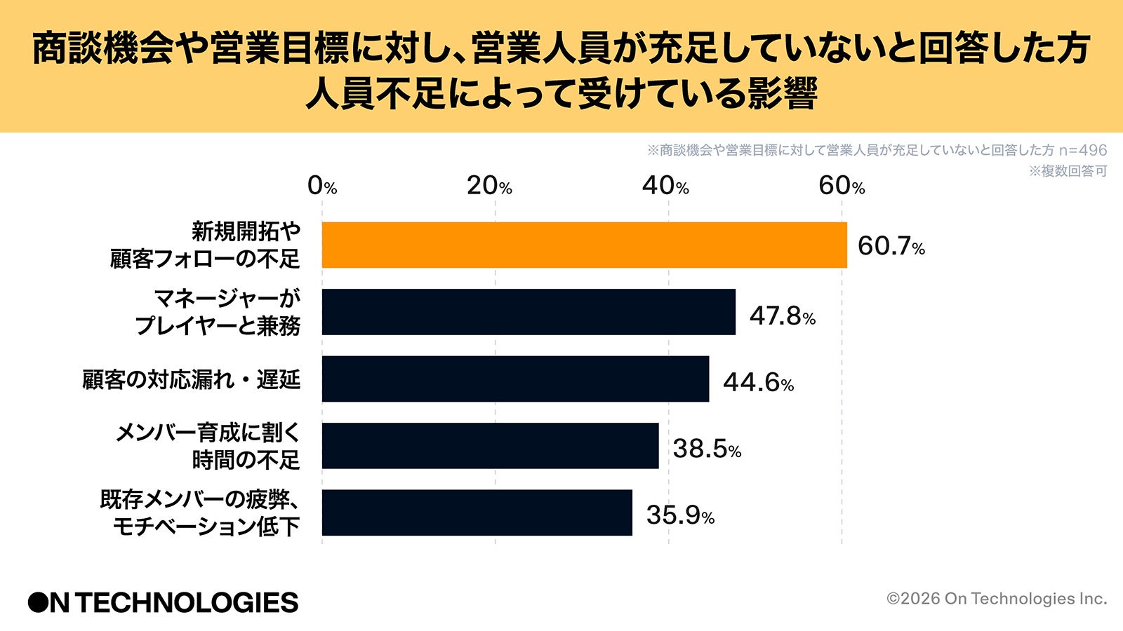調査の結果、具体的な営業マネジメントの課題として最も多く挙げられたのが「営業人員が不足している(60.7%)」でした。その影響として「新規開拓や顧客フォローの不足(60.7%)」や「顧客の対応漏れ・遅延(44.6%)」といった機会損失に加え、「マネージャーがプレイヤーと兼務(47.8%)」という管理職の負担増が見受けられます。