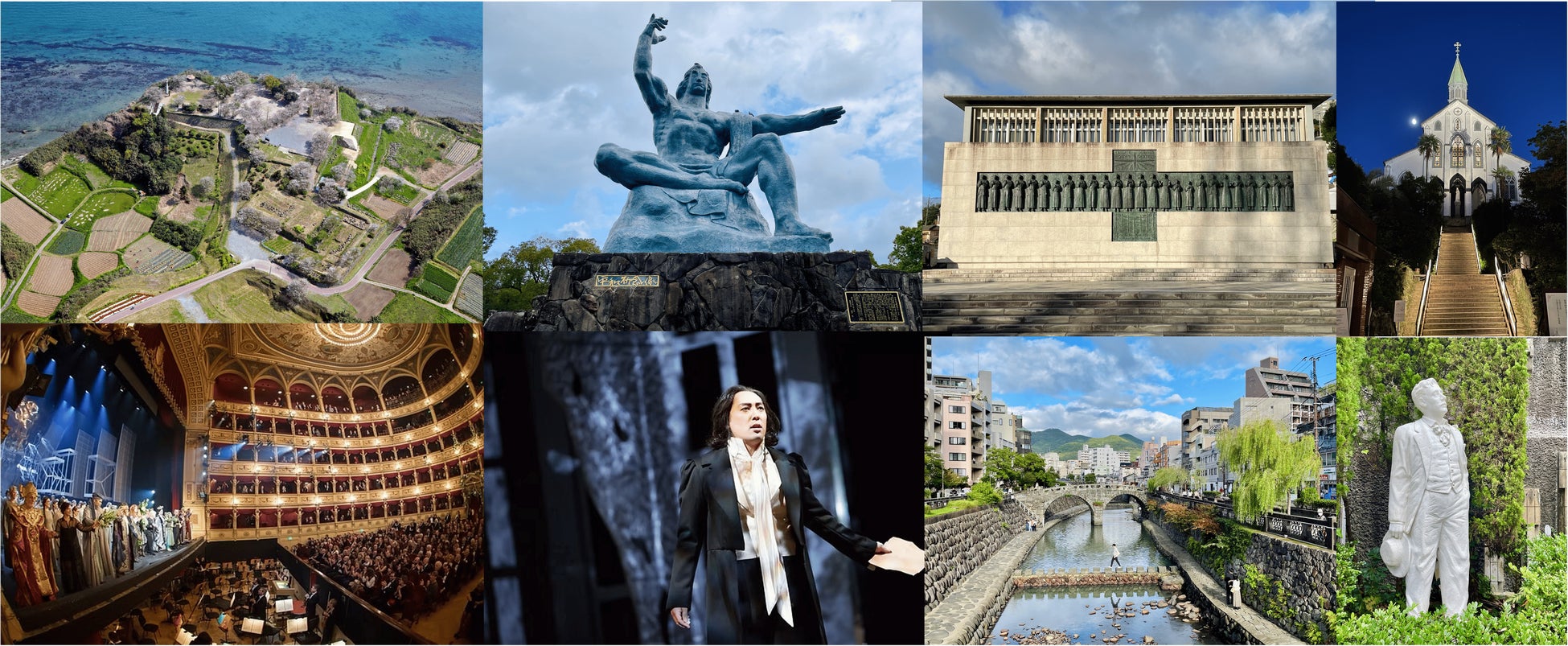 長崎市:⾧崎原爆資料館、平和祈念像、日本二十六聖人記念館、カトリック浦上教会、大浦天主堂など
