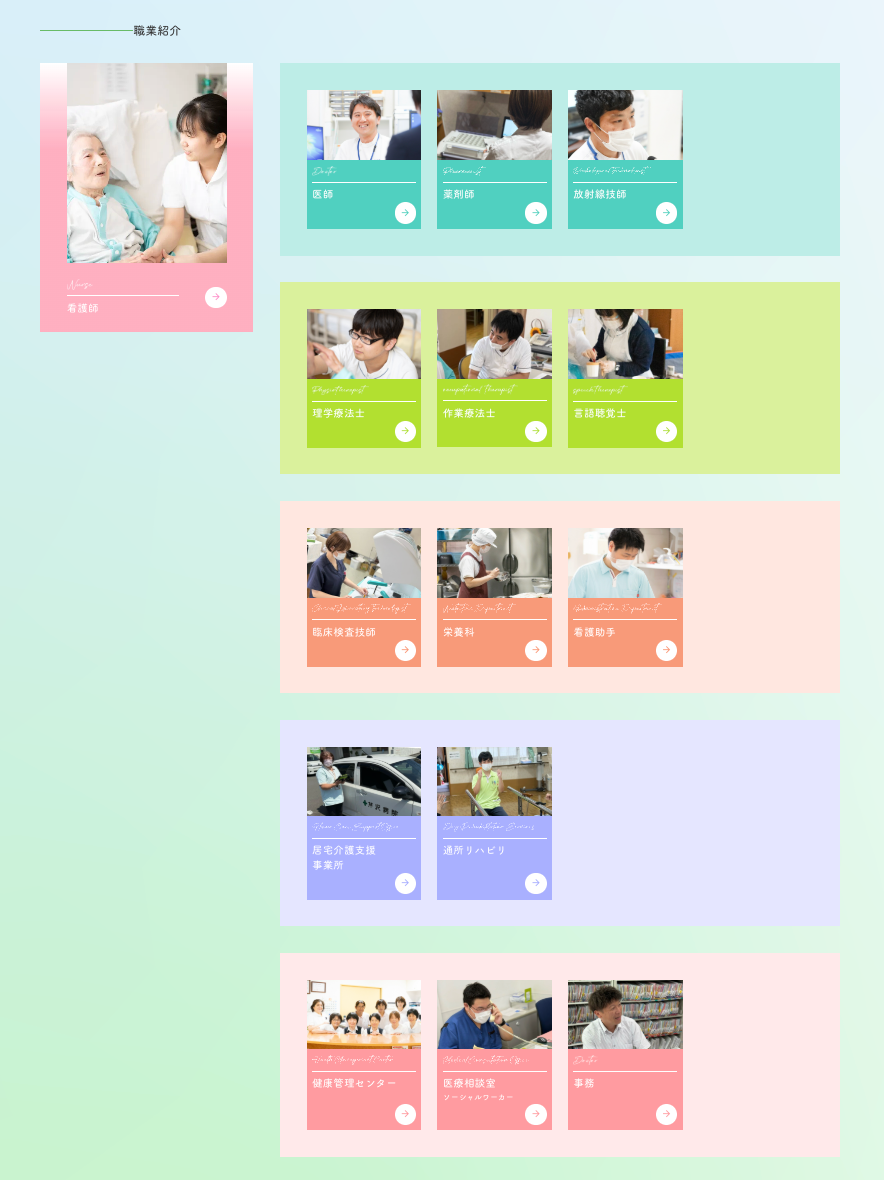 「看護師」「リハビリ職」「介護職」など、職種ごとに独立した採用ページを新設しました。 それぞれのページで、業務内容や所属長のメッセージ、実際に働くスタッフの声(インタビュー)など、その職種特有の知りたい情報を集約。 一般的な病院全体の紹介にとどまらず、求職者が「自分の専門職としての働き方」を深く理解できるようにし、入職後のギャップを解消する設計としました。