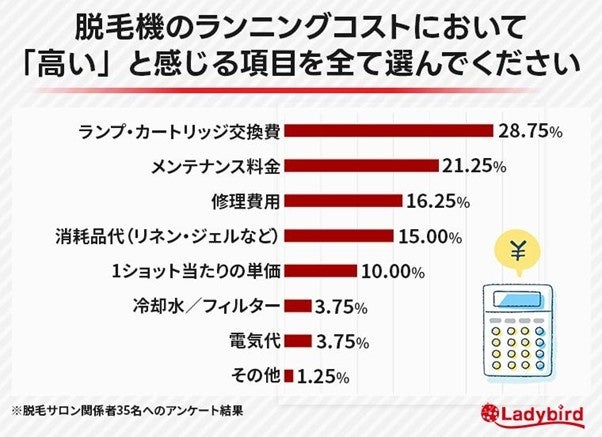 「あなたの人生に驚きと笑顔を創る」をミッションに、業務用美容機器開発・製造・販売・卸業、エステ商材販売、サロン運営支援をしている株式会社レディーバード(本社:東京都品川区、代表取締役社長 横沢直希、以下、当社)は、脱毛サロン関係者を対象に「脱毛器のランニングコストに対するアンケート」を実施しました。