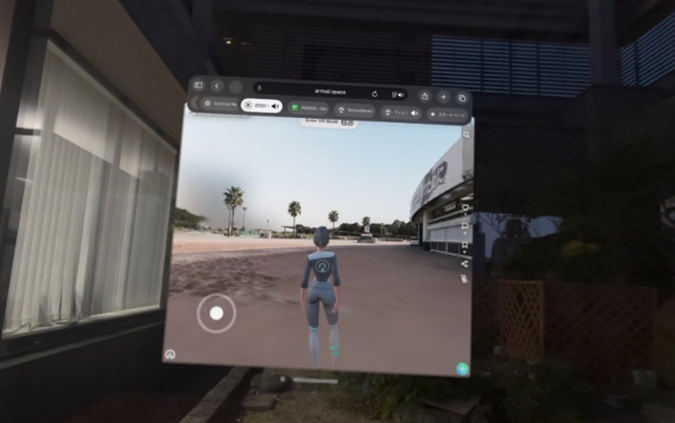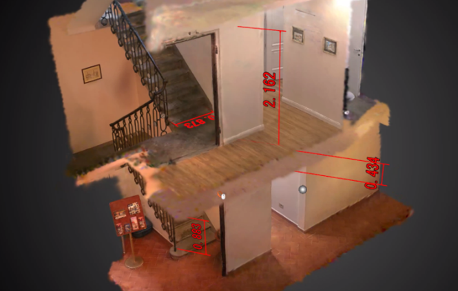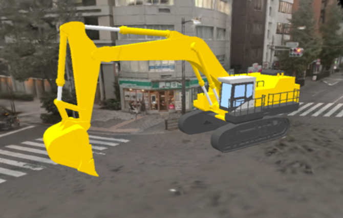 作成された3次元空間には、3次元モデルを配置できるほか、自由に動ける空間を作成することができ、背景に点群データもあるので、距離や面積の計測も可能です。