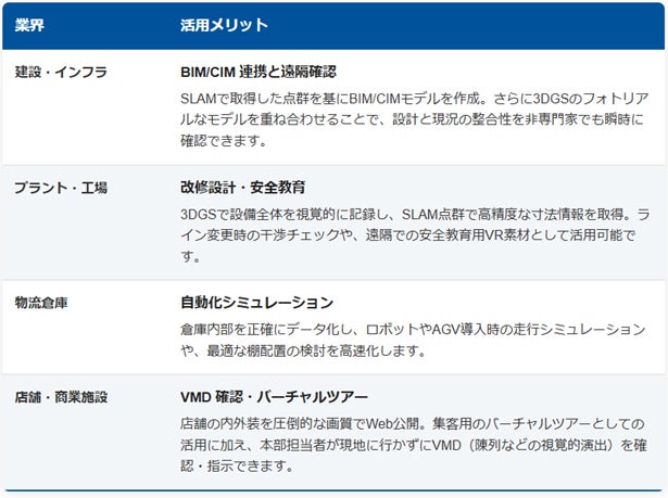本サービスは、建設業に限らず、プラント、物流、製造、店舗といった幅広い産業の「デジタルツイン化」を支援します。