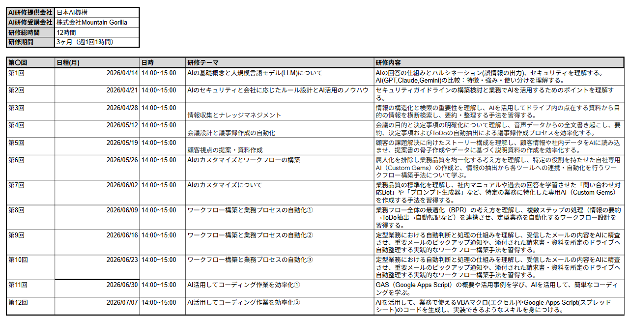 日本AI機構として初となる法人向け生成AIリスキリング講座を、Mountain Gorilla社にて2026年4月14日より開始いたします。