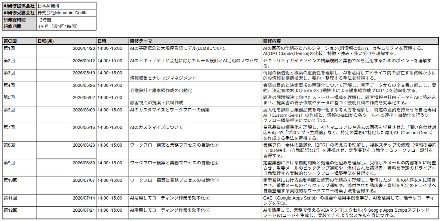日本AI機構として初となる法人向け生成AIリスキリング講座を、Mountain Gorilla社にて2026年4月28日より開始いたします。