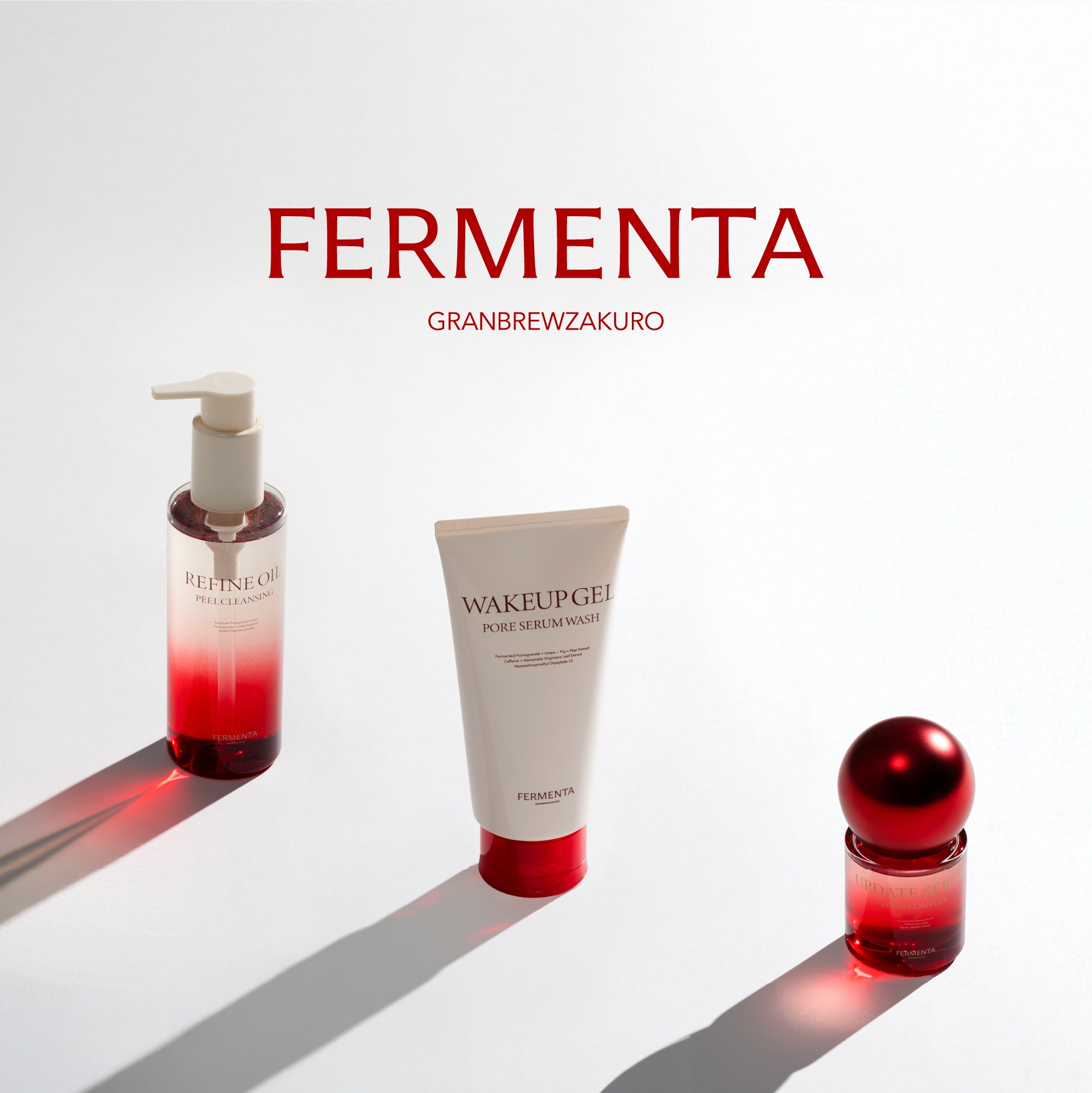 ブランドの核となるのは、完熟ザクロを乳酸菌でじっくりと発酵させた注目成分 “グランブリューザクロ(乳酸桿菌/ザクロ果実発酵エキス)”。FERMENTAすべてのアイテムに共通配合されています。