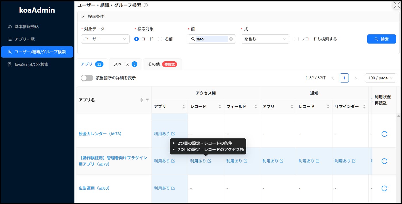 アプリ設定からレコード内のデータまで横断検索。ユーザー・組織・グループの変更に伴う調査業務を劇的に改善。