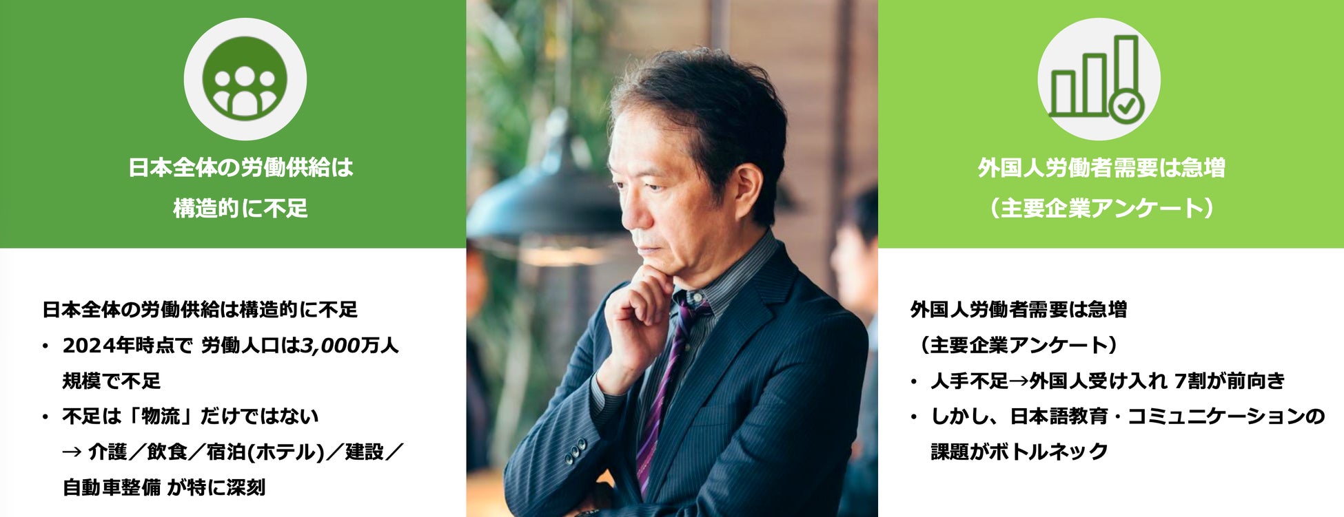 人手不足が深刻化する中、外国人労働者の受け入れを積極的に検討する企業は7割にのぼるという主要企業アンケート結果も公表されています。一方で、「外国人労働者の日本語教育」「コミュニケーション課題」が依然として大きな障壁となっています。