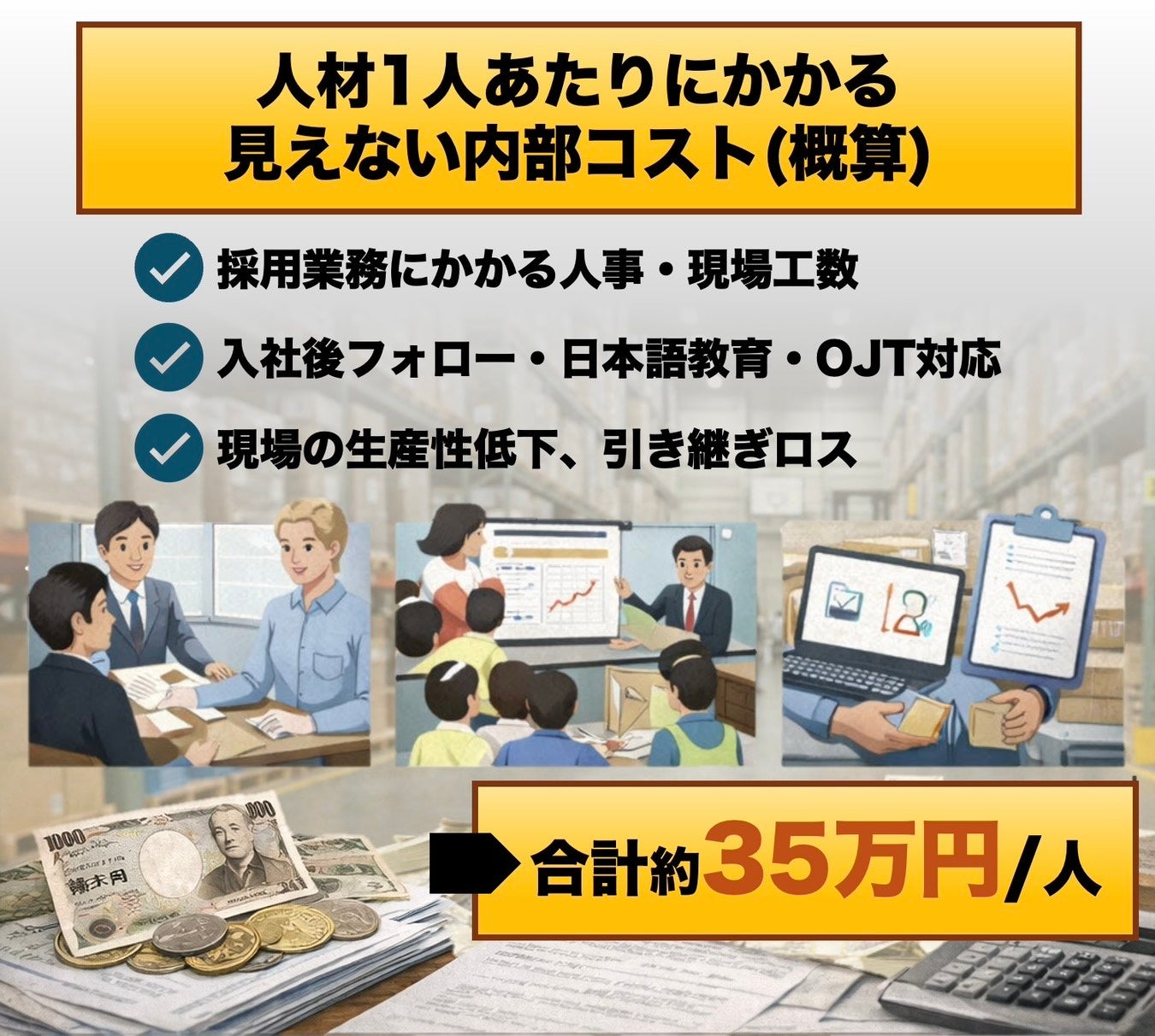 人手不足対策として外国人労働者の受け入れが進む一方、多くの企業が注目しがちなのは「紹介料」や「採用コスト」です。しかし、本当に企業経営に影響を与えているのは、離職によって毎年発生し続ける“見えない内部損害”です。ドライバーや倉庫作業員が1名離職した場合、以下の内部コストが確実に発生します。