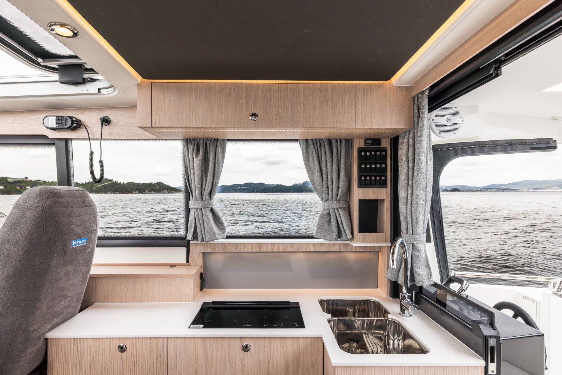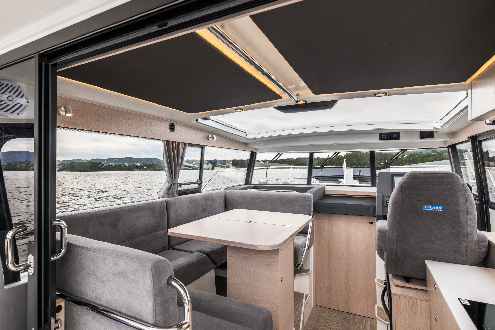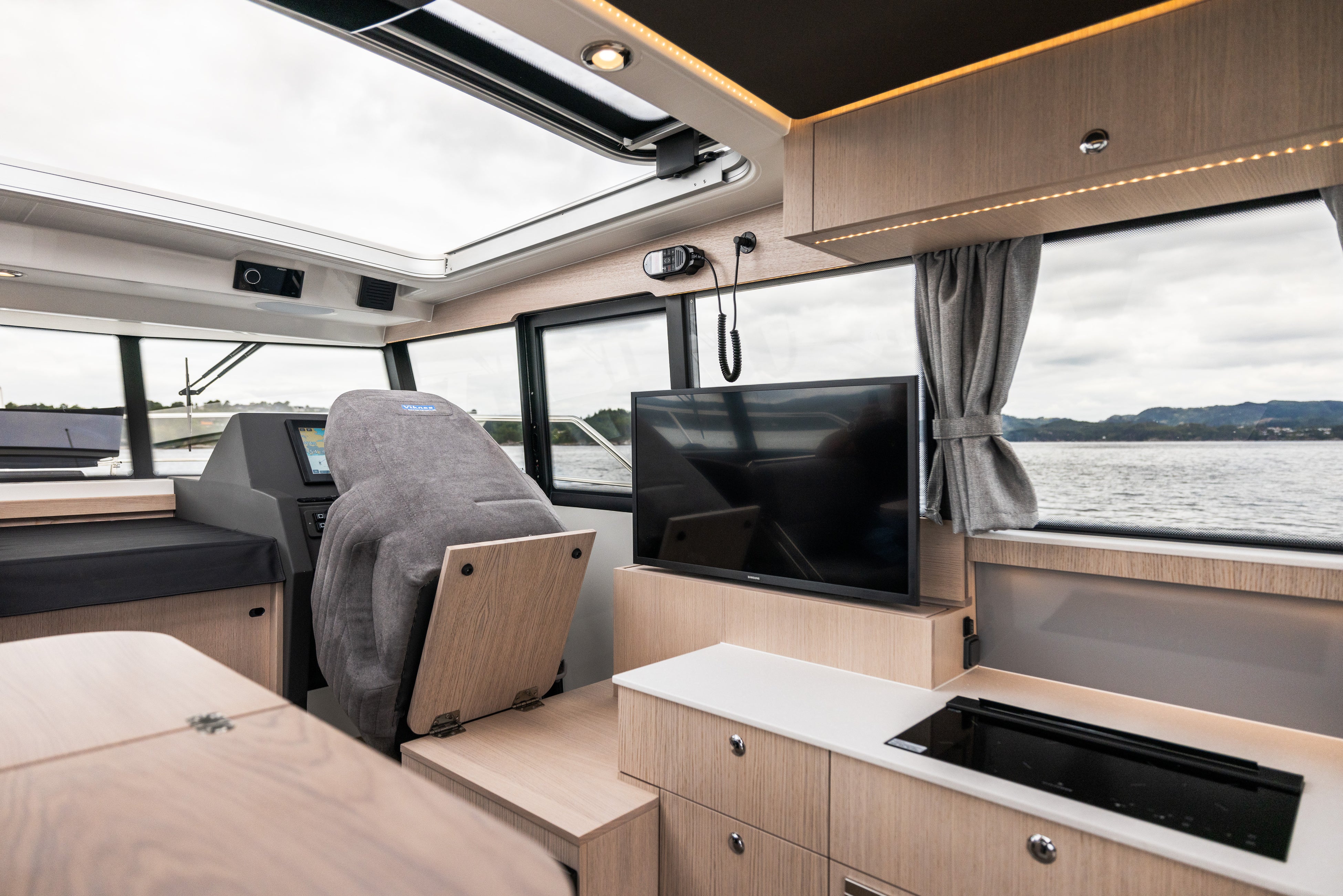 Viknesシリーズの特徴は、前傾したフロントウィンドウと広々とした後部デッキ。特に前傾ウィンドウは視界の良さに優れ、実用性と美しさを兼ね備えた印象的なフォルムとして知られています。荒天下でも安定した走行性能と、温もりあるインテリアを両立し、長時間の航海でも快適に過ごせる居住性を備えているのです。