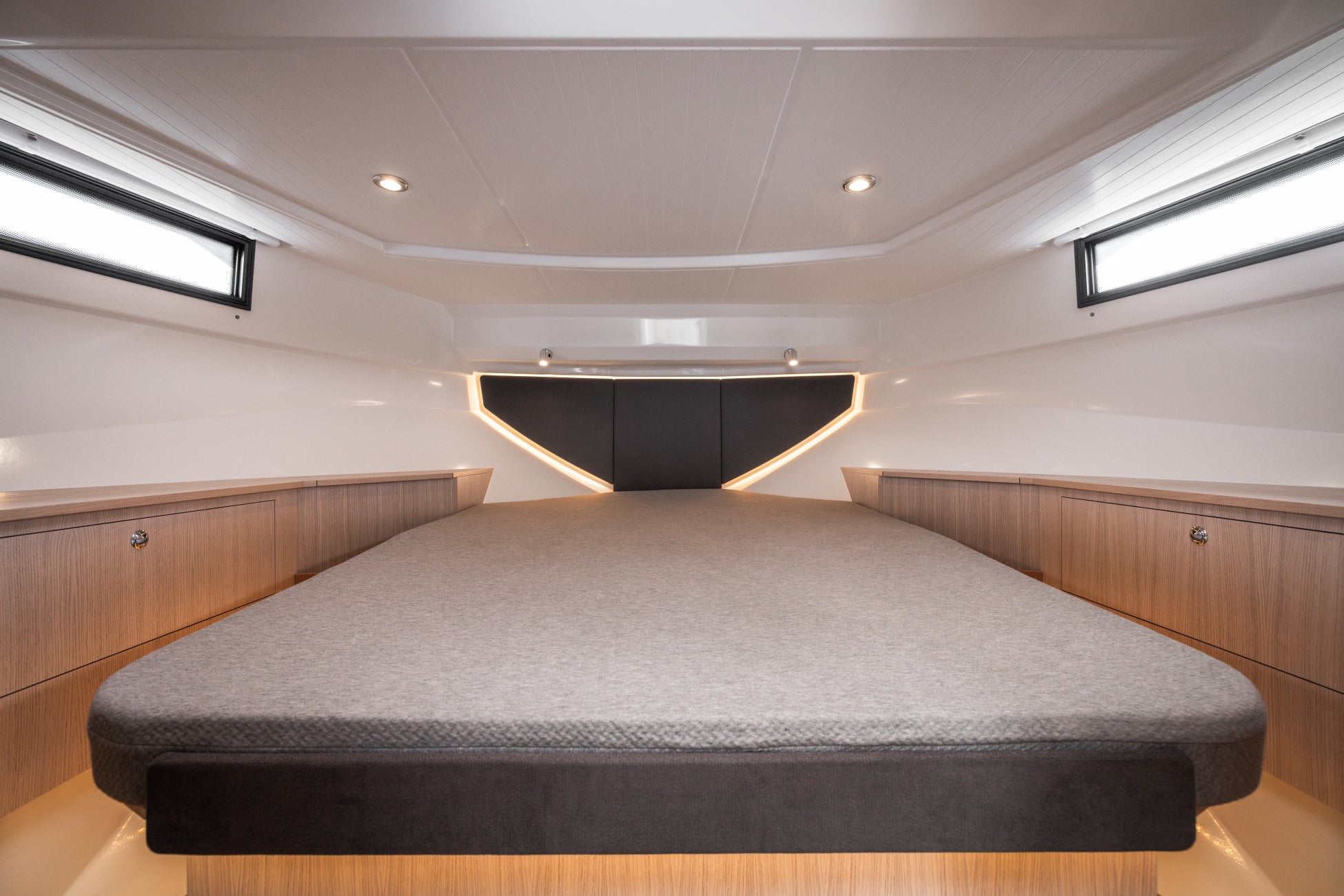 メインキャビン(主寝室)は広々としており、収納クローゼットも、ベッドサイドやベットの下に設置。間接照明のあたたかみのある光で、夜も快適に過ごせます。