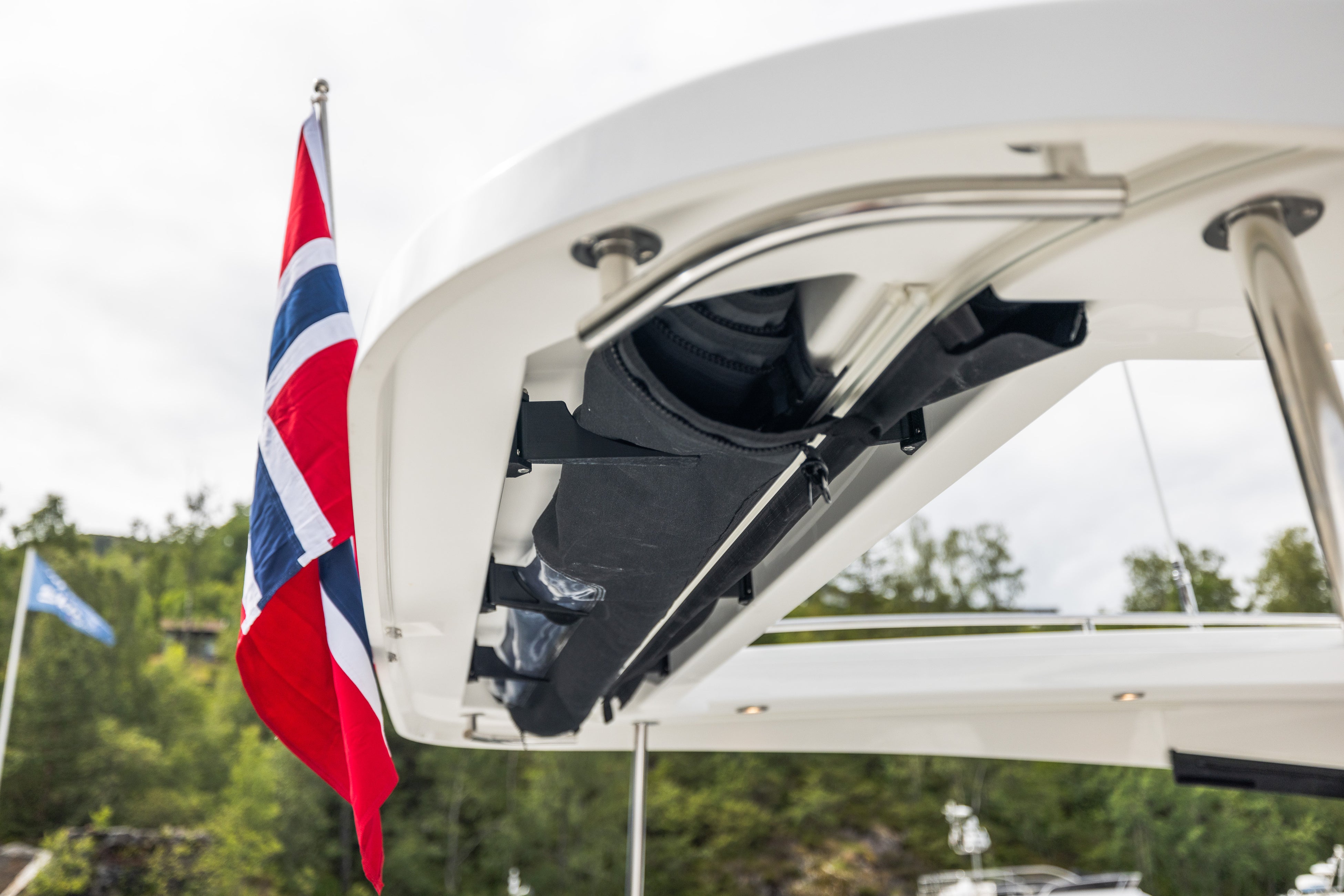 船の後方部分(アフト)に設置されているエンクロージャー(クルーザーのデッキ部分を覆うカバーや囲いのこと)のこだわりは、収納が便利で簡単であること。デザイナーのこだわりが現れています。