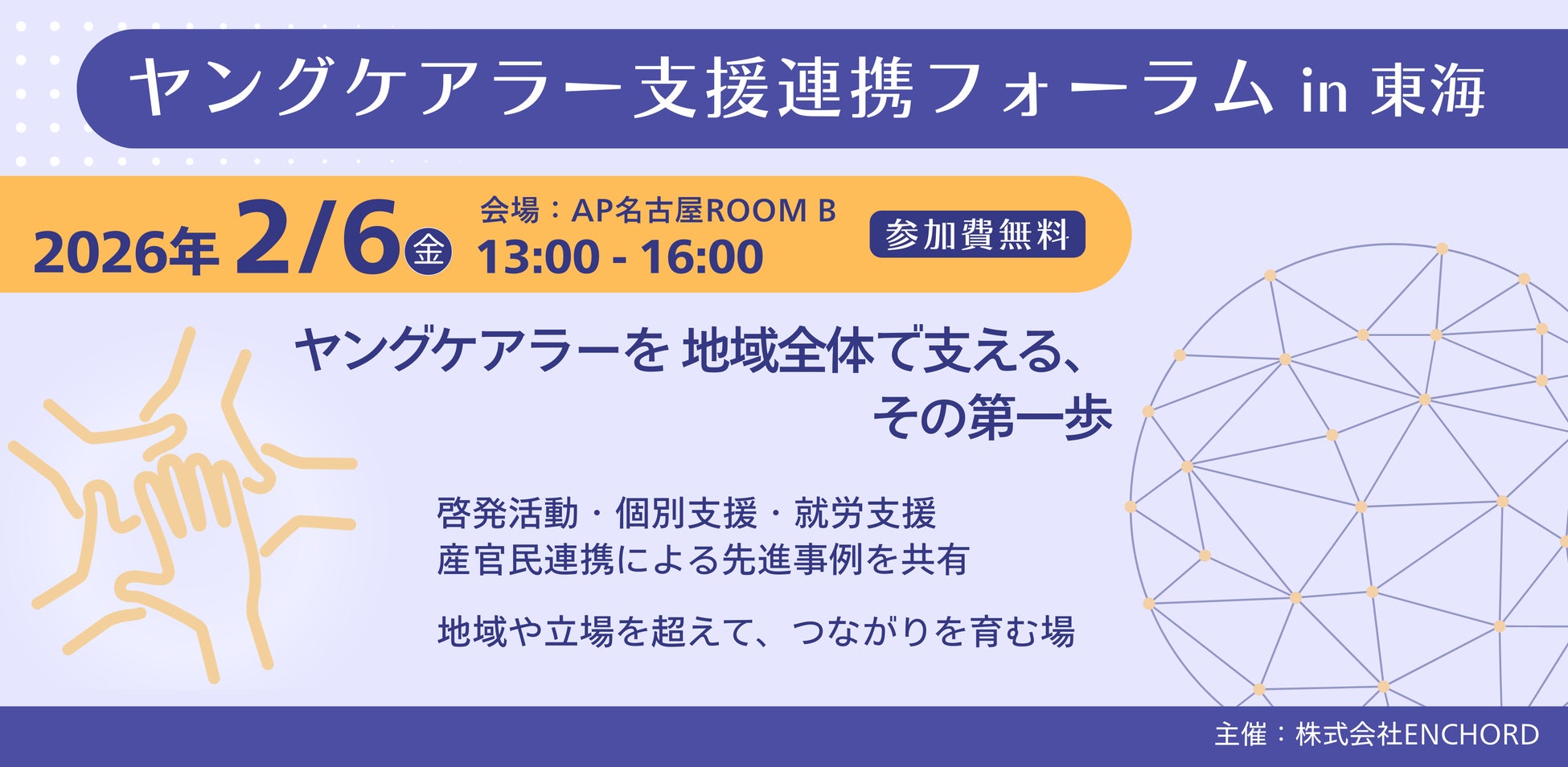 株式会社ENCHORD(本社:東京都港区、代表取締役:髙垣内文也)は、東海地方のヤングケアラー支援の連携を促進するため、ヤングケアラー支援連携フォーラムin東海を開催します。