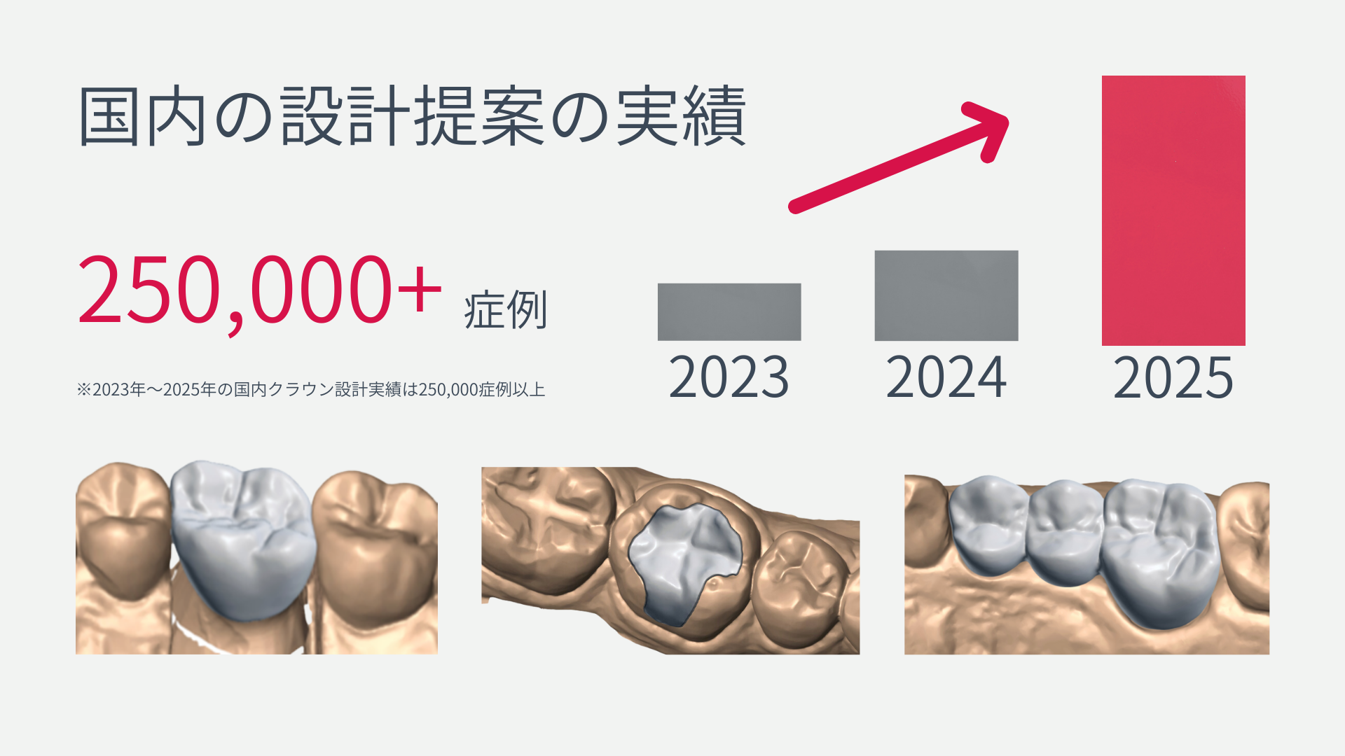 国内における「Automate」の累計設計症例数は25万件を超え、特に2025年は前年比4倍以上の伸びを記録しました 。この急増は、AI設計が日本の技工現場に深く浸透し始めたことを示しています 。