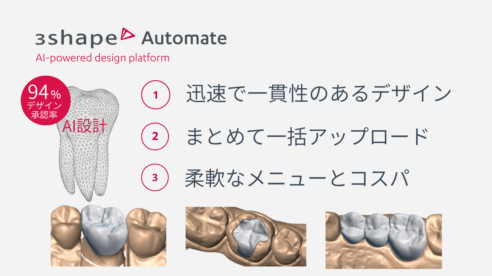 2021年に国内リリースされた「Automate」は、25万症例以上のデータから学習したAIが、ユーザーの設定した設計条件や納期に合わせて自動設計を行うシステムです 。