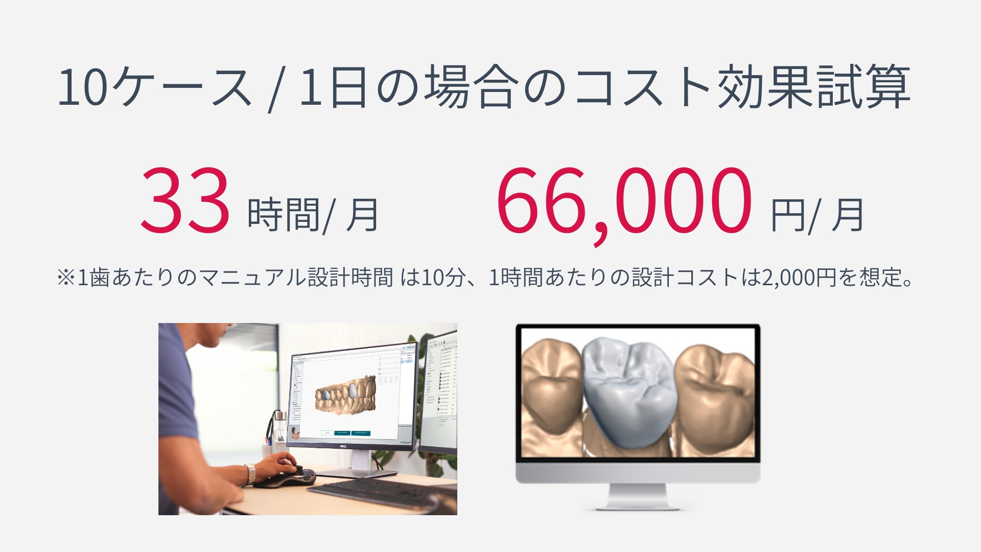 【コスト・生産性の試算例】 1日あたり10症例のクラウン設計をAIに任せる場合、月間(20日稼働想定)で約66,000円のコスト効果が得られる計算となります 。 3Shape Dental SystemユーザーはLAB Careサービス(年間ライセンス)の特典としてAutomateが利用可能となっており、上記コスト効果を年間で試算した場合、70万円以上のコストメリットが見込まれます 。