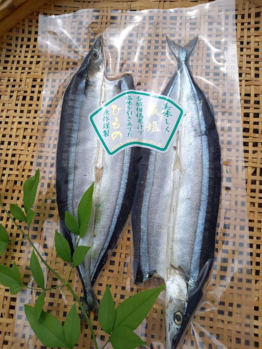 サンマの内臓を取り除かずに、塩で揉み込み余計な水分を出します。この水分を取り除く工程が、魚の生臭さを抑えて旨みを凝縮させます。そこに串をうち乾燥させます。熊野の地が生んだ伝統ある製法です。