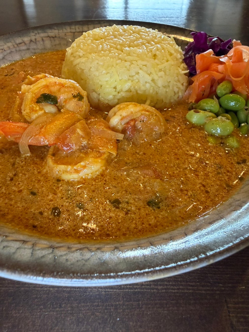 濃厚海老カレー ──濃厚な海老とココナッツミルクのクリーミーの中にスパイスもしっかり感じられる一皿になっています。