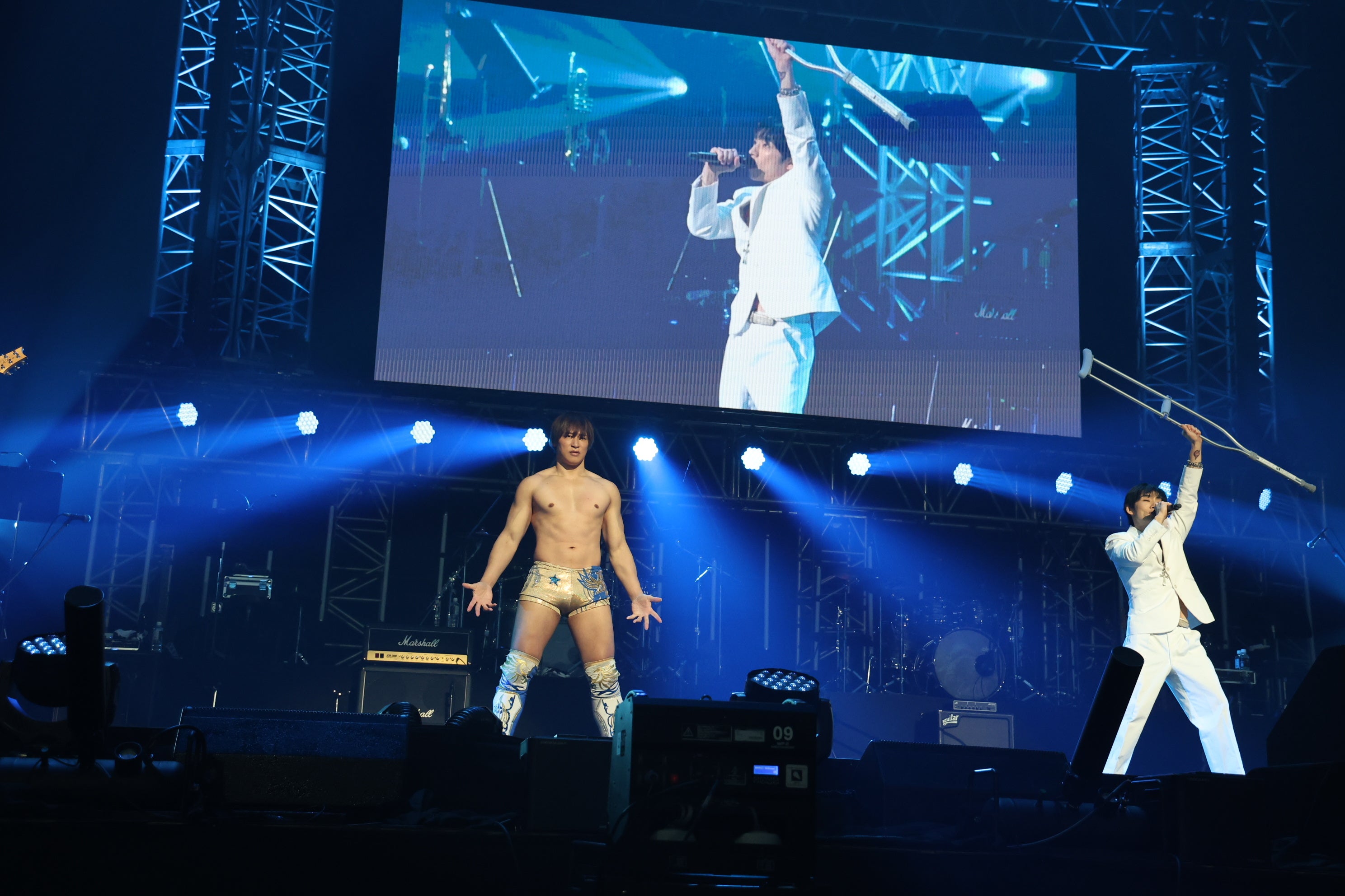 DUALのステージではプロレスラーの飯伏幸田さんが登場しDUALの解散ライブをメンバーの背後から支えました。飯伏幸田さんは2025年10月にAEWで「右大腿骨骨折」を負い「全治1年、復帰まで2年」という状況の中、松葉杖で登場、松葉杖を外し自らの足で立つという不屈の精神を見せてくれました。