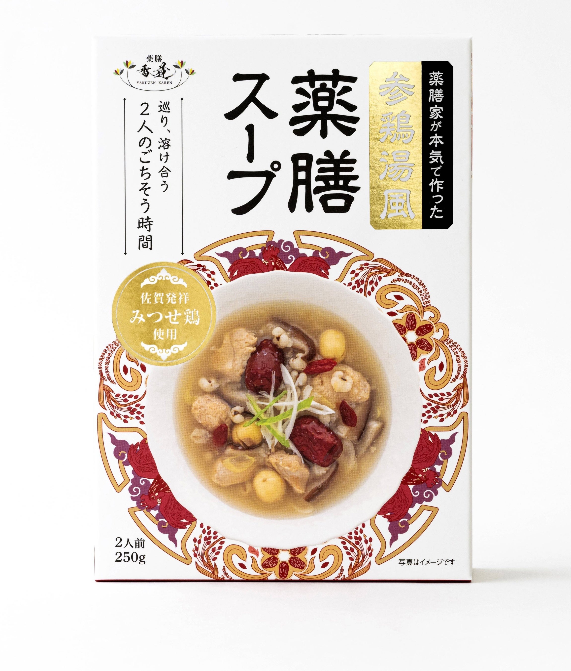 特徴: 佐賀産の銘柄鶏「みつせ鶏」をベースに、クコの実、なつめ、蓮の実、はと麦など、滋養に優れた薬膳食材を贅沢に配合。