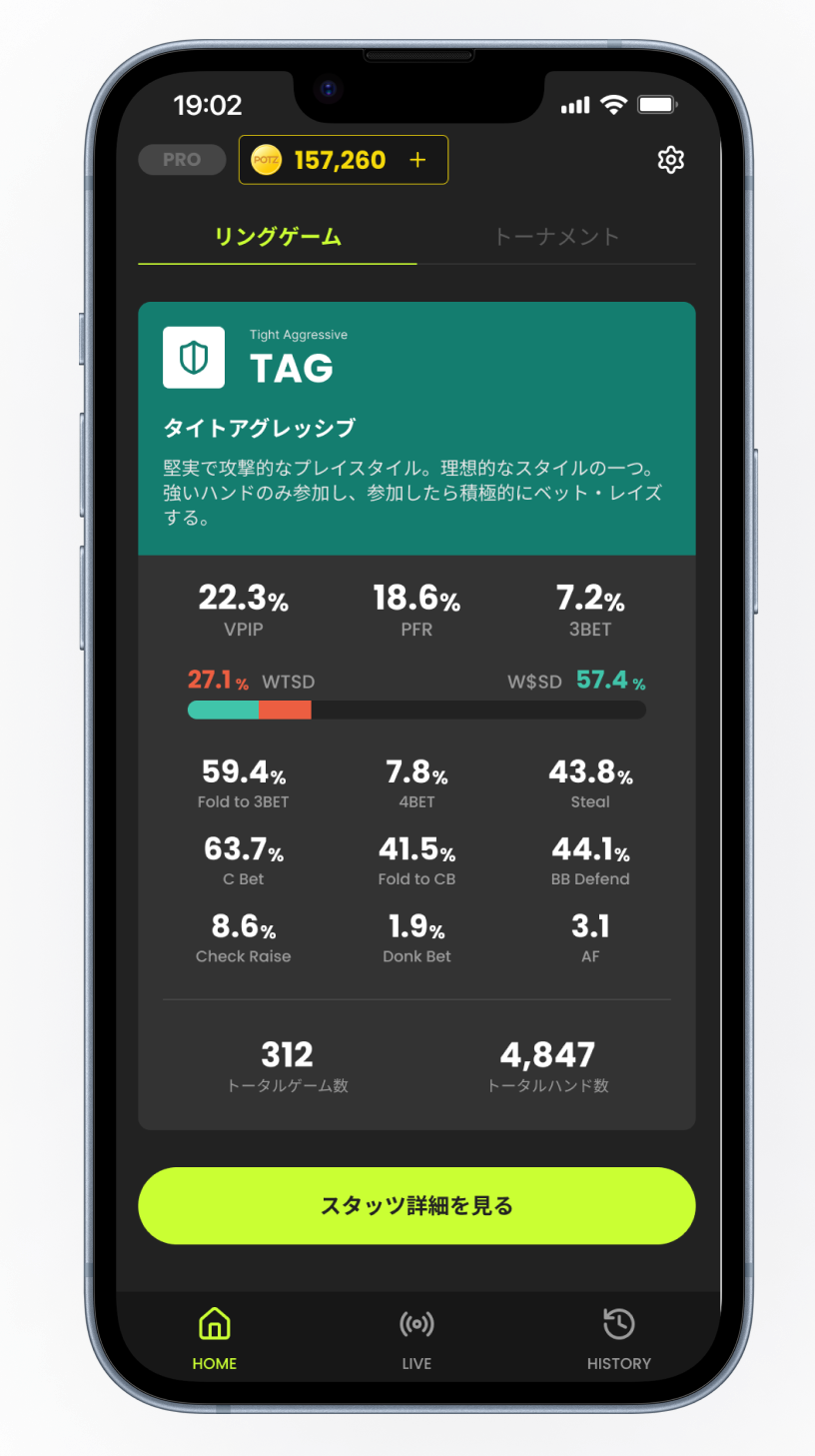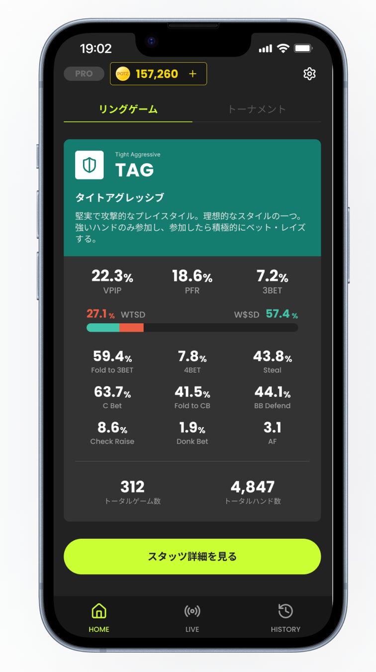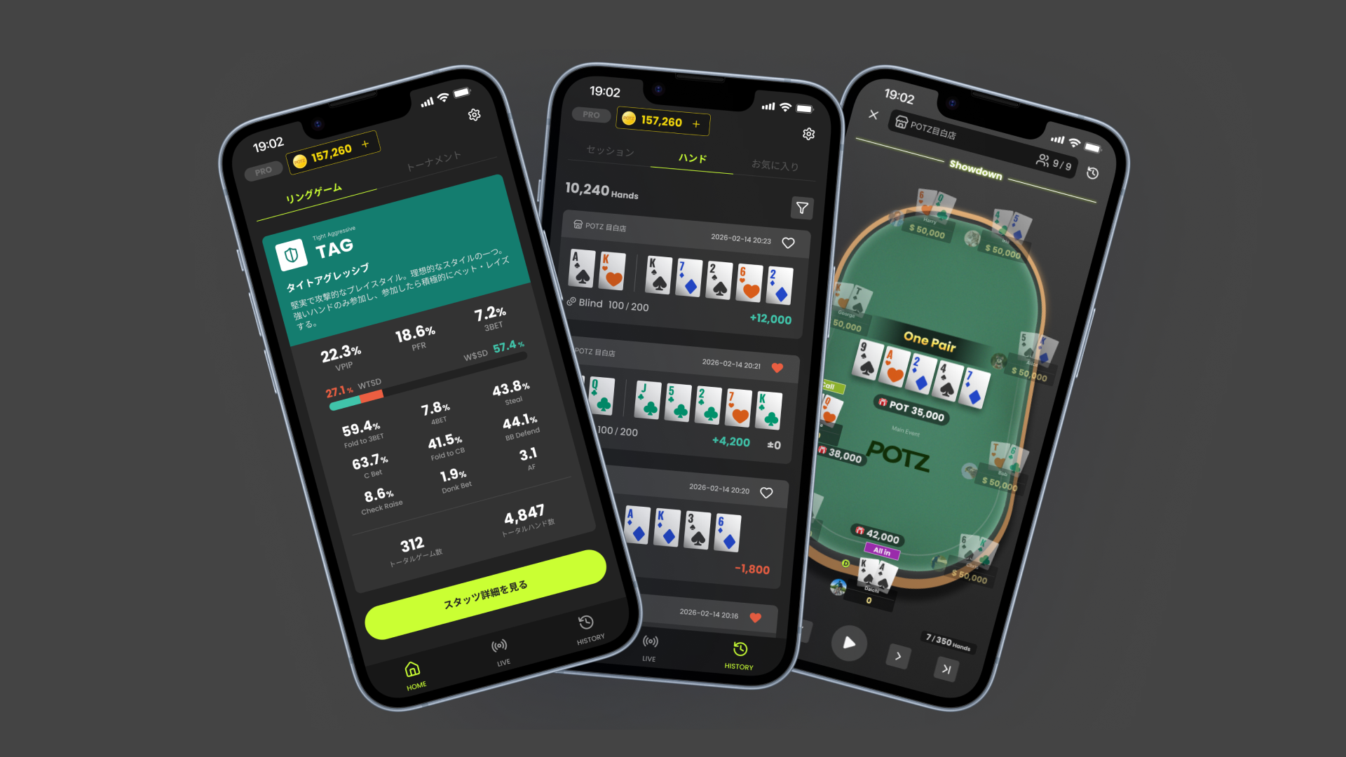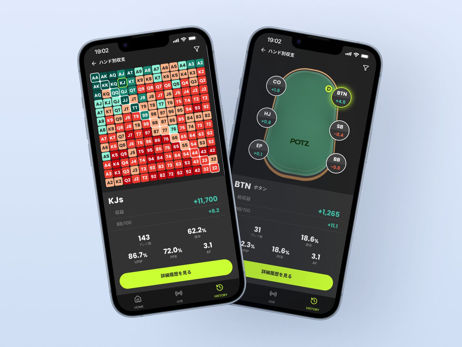 POTZでは、第1弾リリースとして、ライブポーカーのハンド履歴を記録し、スタッツとして確認できる環境を提供します。