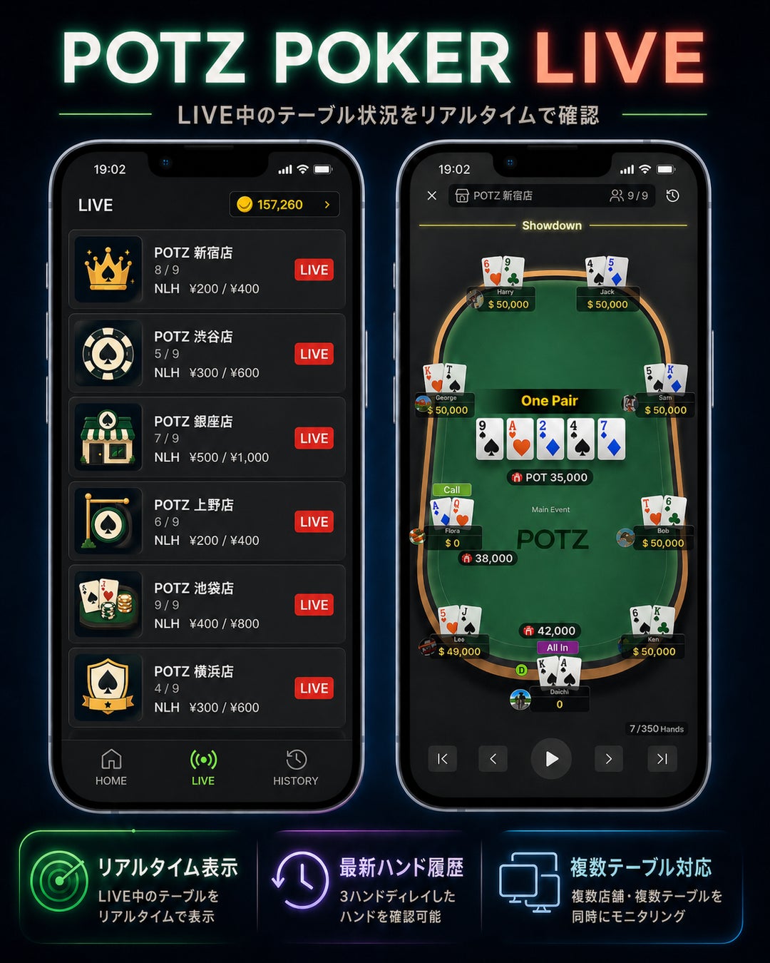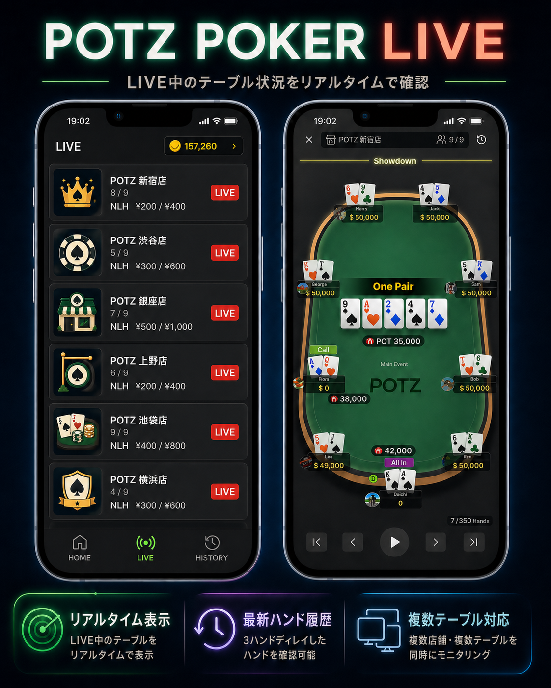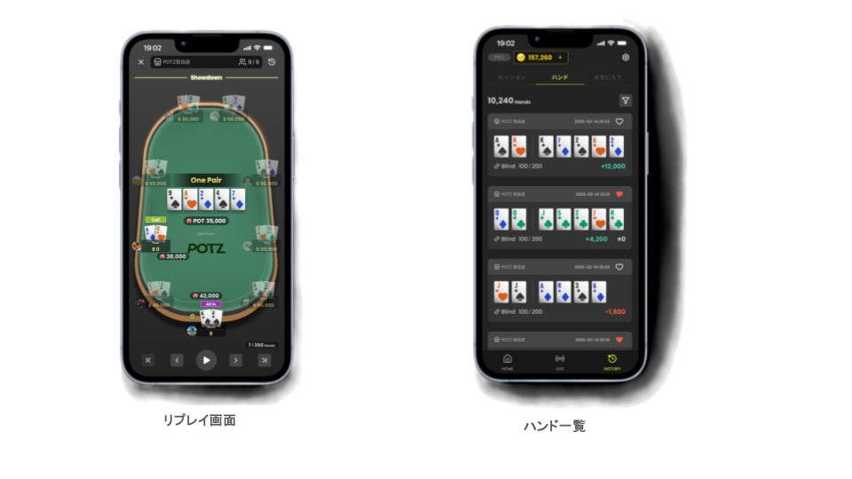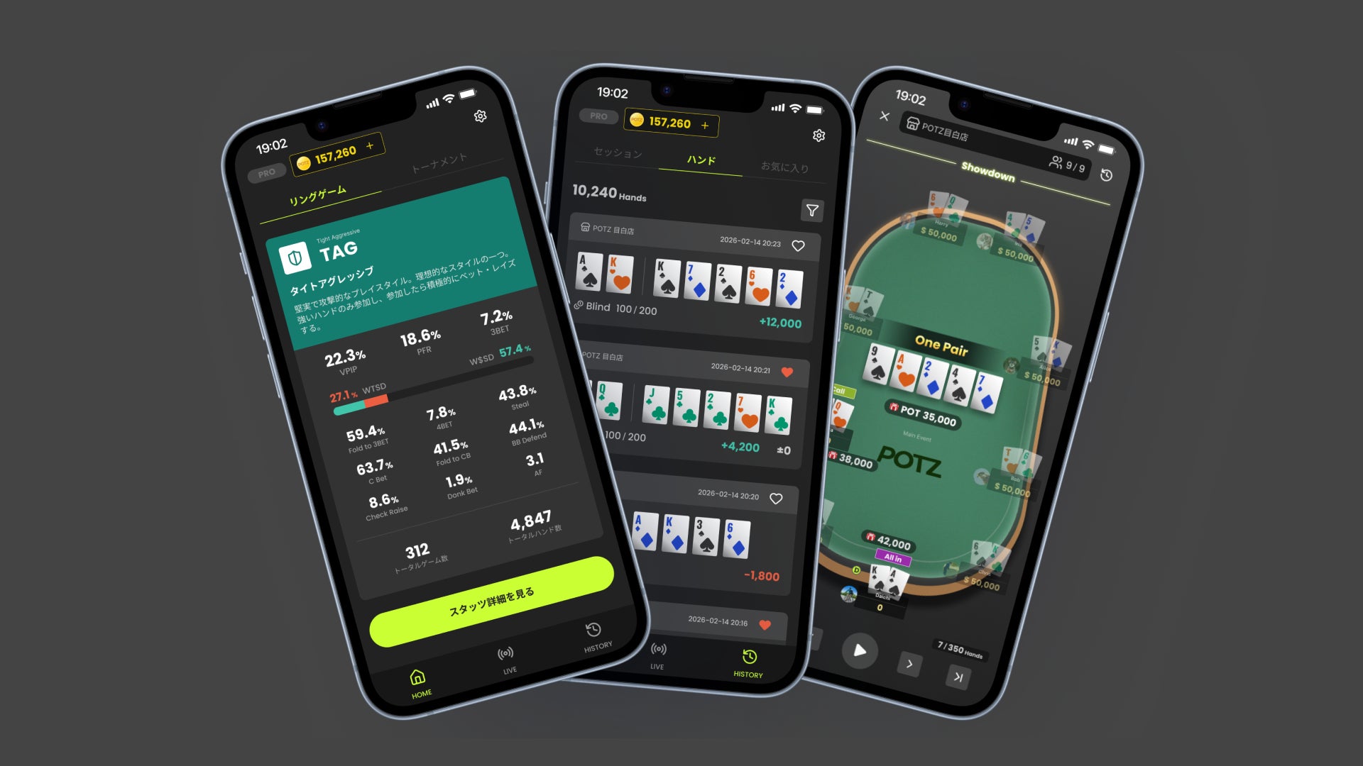 2026年4月28日、株式会社POTZ(本社:東京都新宿区、代表取締役:渡辺悠人)とAlanse株式会社(本社:北海道札幌市、代表取締役:岡崎大地)は、ライブポーカーのハンドやアクション履歴をデータとして記録・蓄積し、スマートフォンから確認・分析、プレイの振り返りに活用ができるプレイヤー向けモバイルアプリ「POTZ POKER」を公開します。