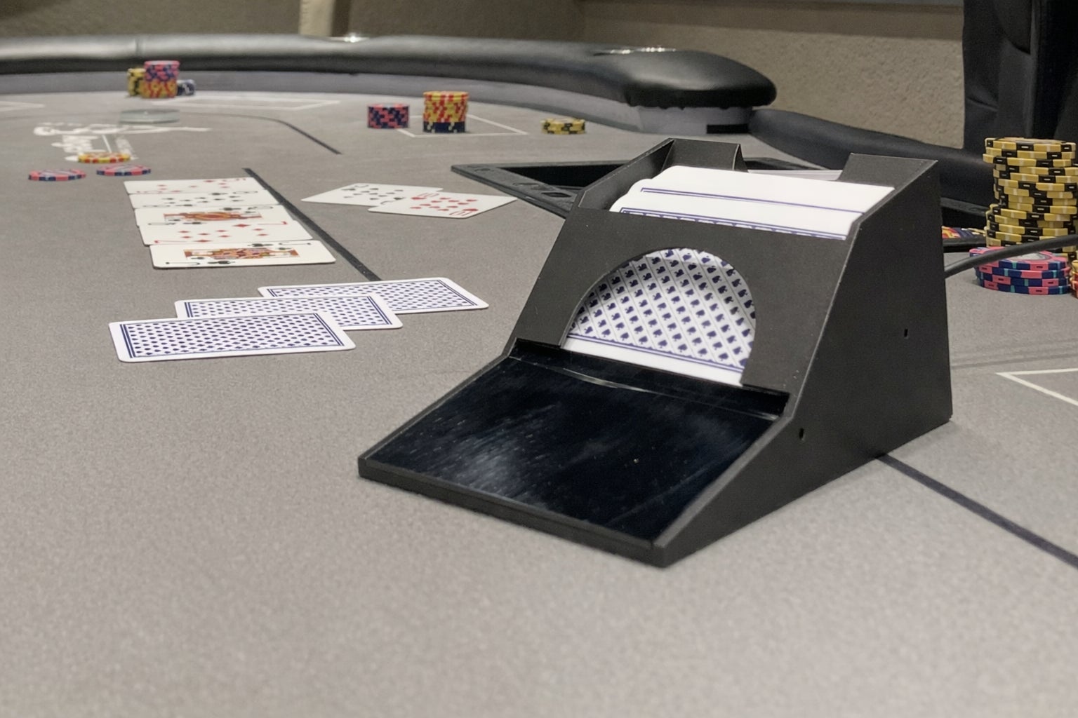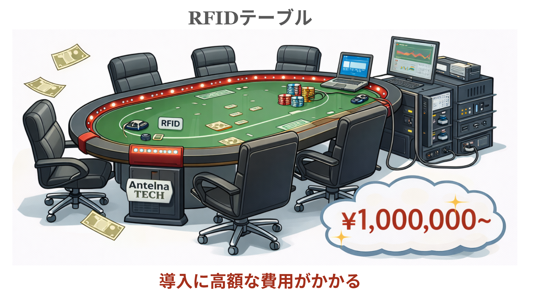 このシステムでは、デックシュー型のRFIDリーダーを用いることで、配られるカードを自動で読み取り、ハンド情報を正確に取得することを実現してきました。