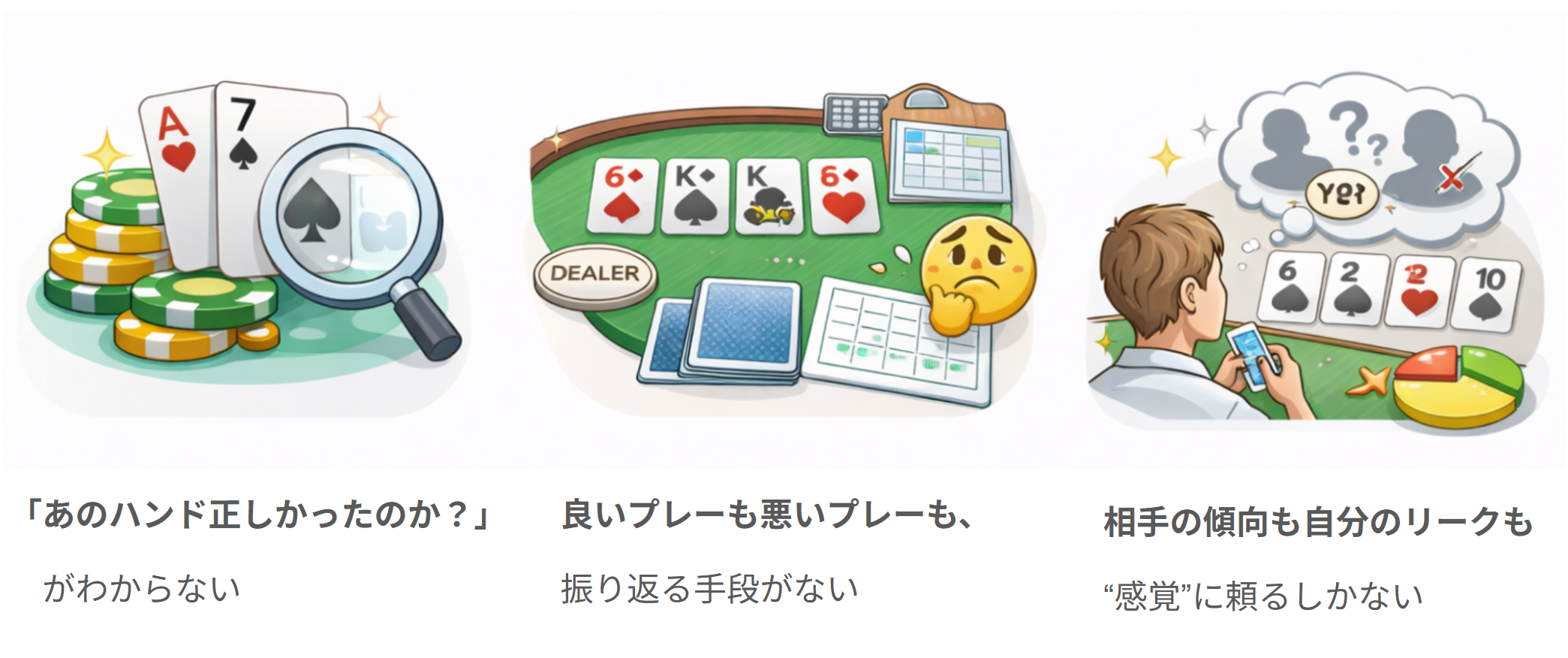 オンラインポーカーでは当たり前の「ハンド履歴」や「データ分析」は、ライブ環境ではほとんど実現されていません。