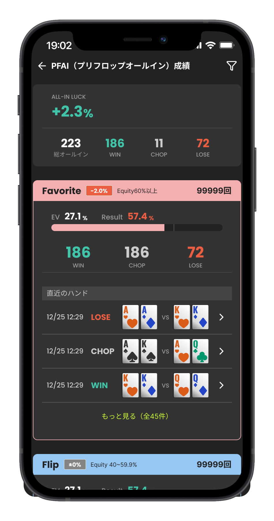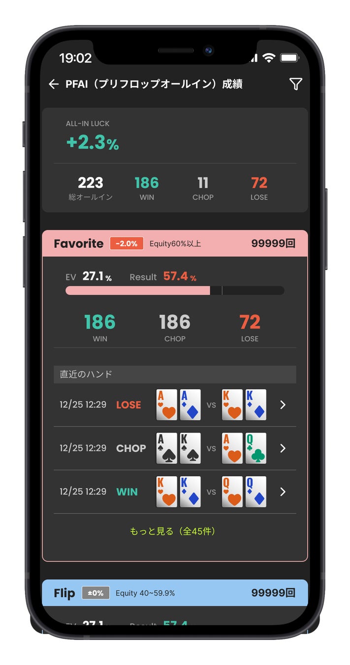 POTZでは、オールイン時の本来の勝率と実際の結果を比較することで、