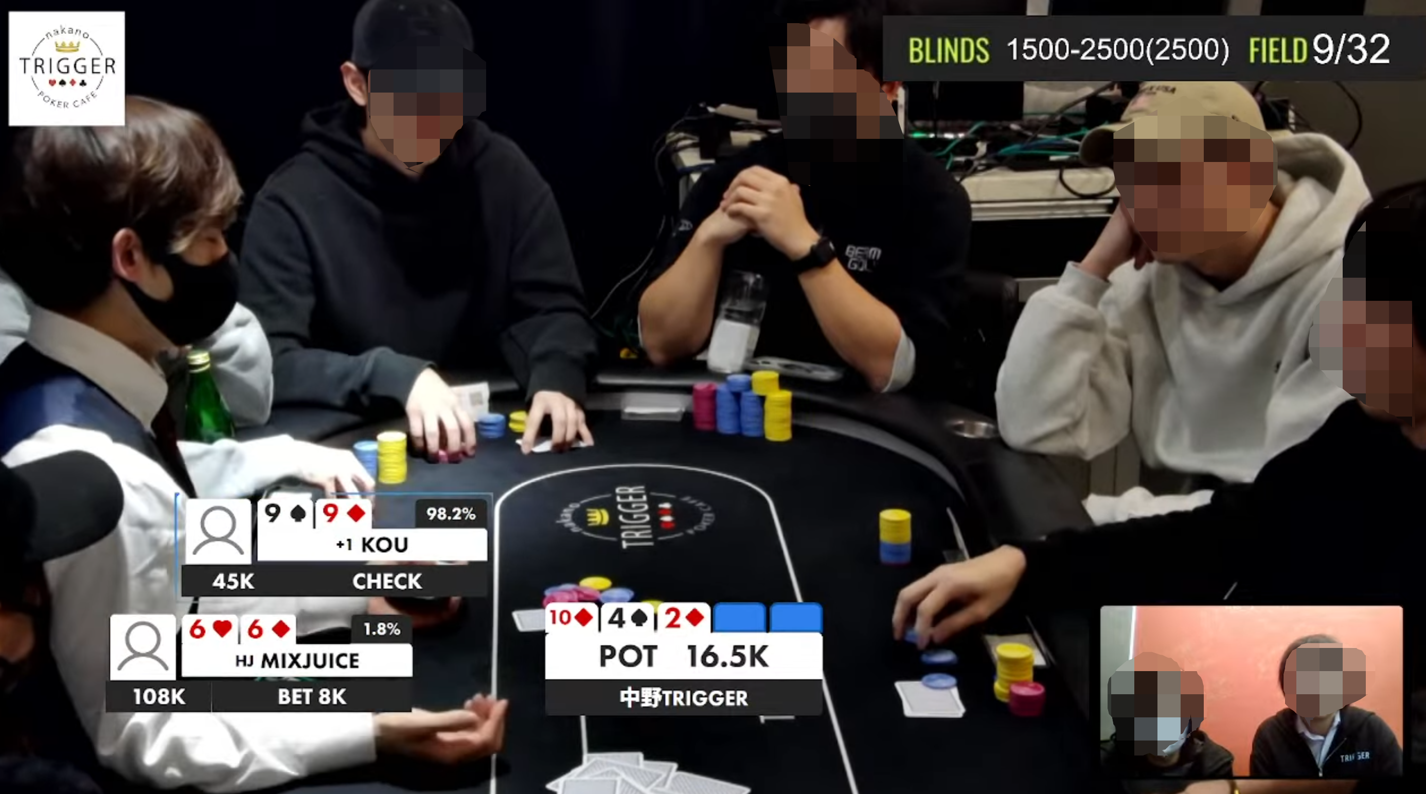 複数店舗・複数テーブルの進行状況を一覧で把握でき、3ハンドディレイされた最新ハンド履歴も確認可能です。