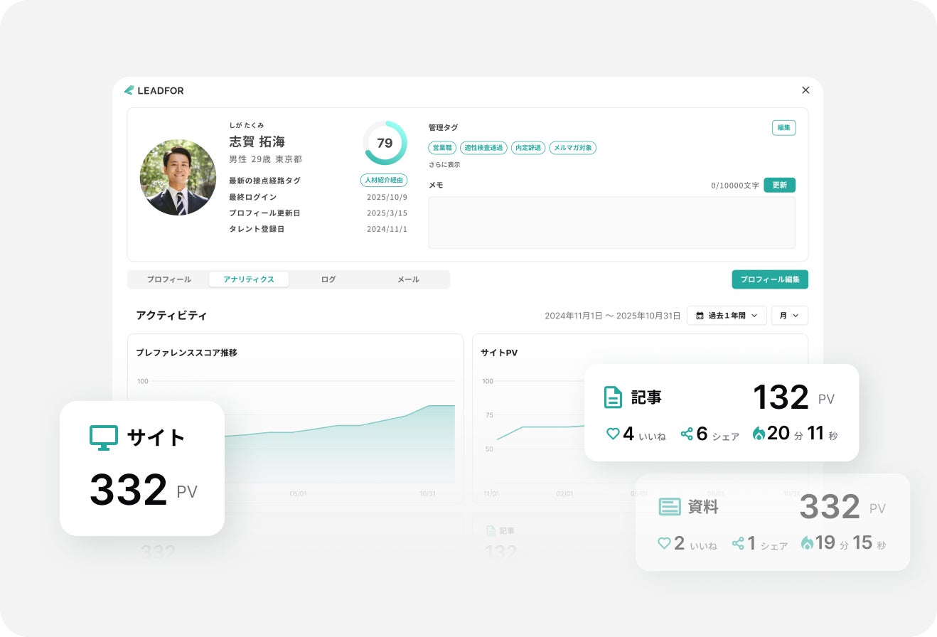 採用難が常態化する中、「応募数は集まるが辞退が増える」「過去に接点を持った候補者データを活かしきれない」といった課題に対し、LEADFORは“候補者に選ばれる採用”をデータ起点で実現する新しい採用マーケティングの形を提供します。