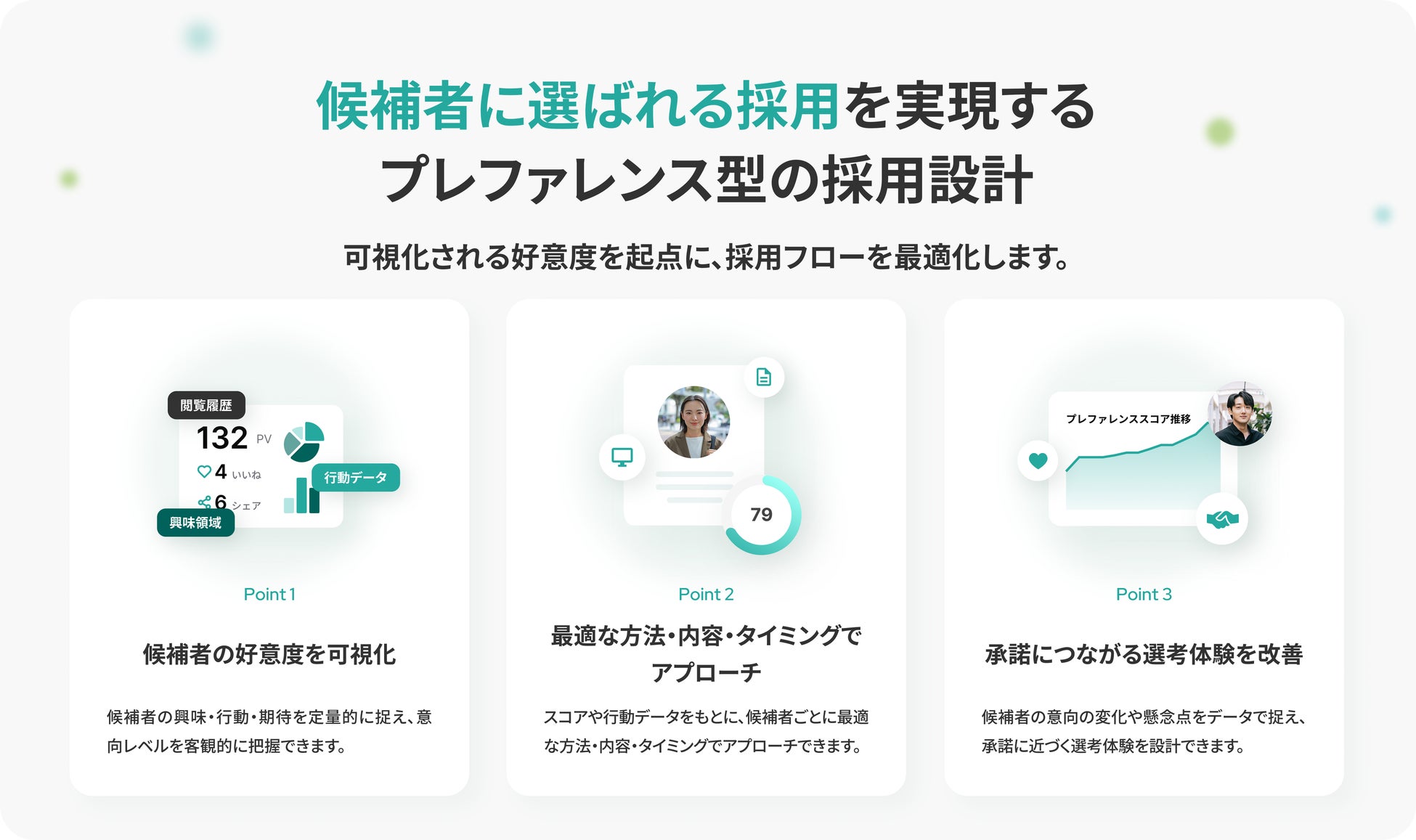 それらのデータをもとに、候補者の状態を理解し適切な方法・内容・タイミングでアプローチを行うことで、企業側の一方的な判断に依らない、相互理解を前提とした採用を実現します。