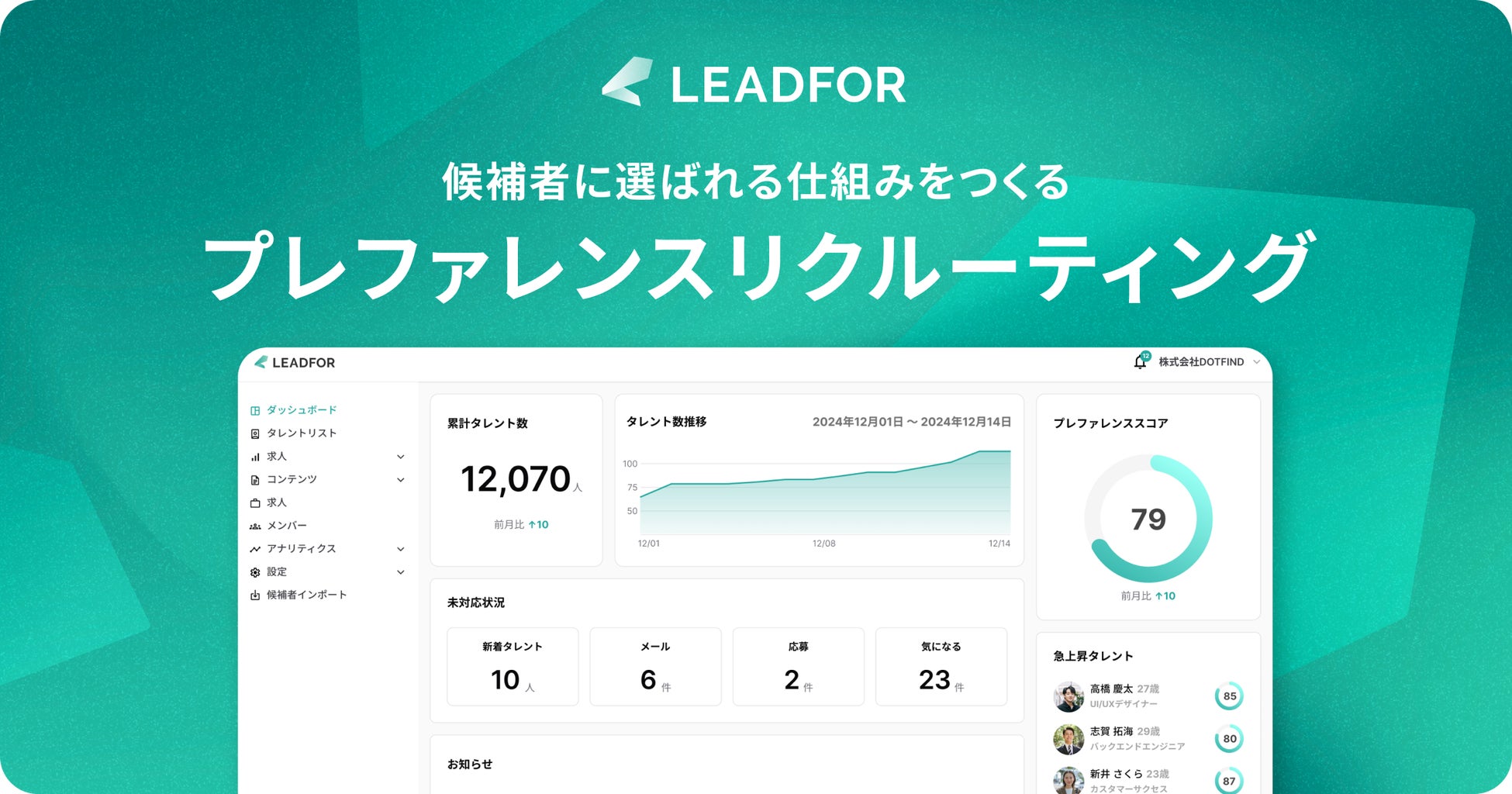 株式会社DOTFIND(本社:東京都渋谷区、代表取締役:中島 陸)は2026年1月21日、候補者に選ばれる採用を設計するプレファレンスリクルーティングSaaS「LEADFOR」をリリースしました。