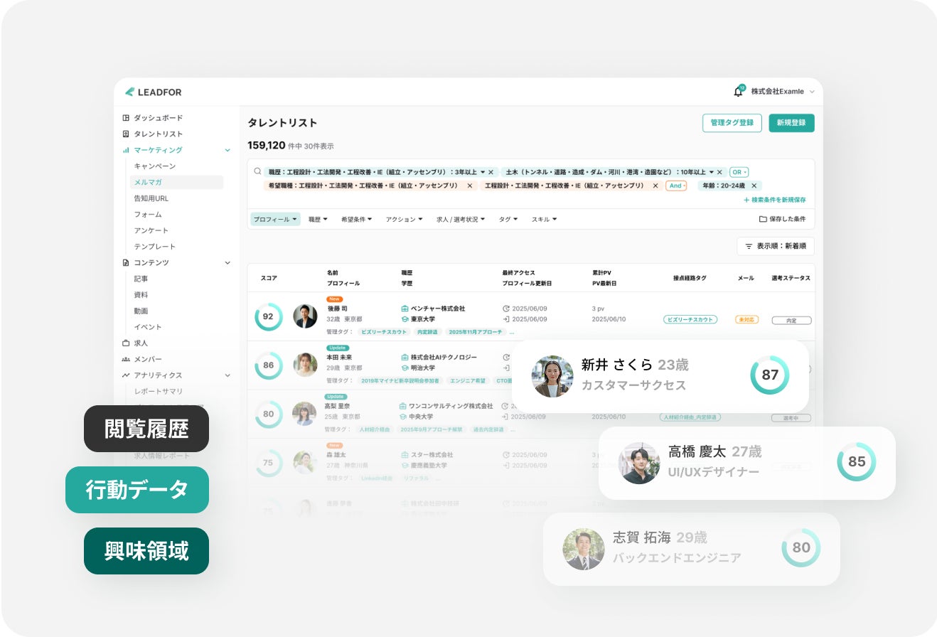 候補者の行動・意向データをもとに、最適なタイミング・内容・手法でのアプローチを可能にする採用マーケティングSaaS