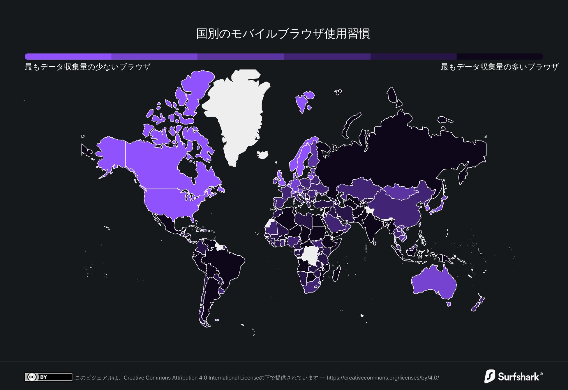 Surfsharkは、各国のユーザーが使用しているブラウザに基づき、どの国が最もプライバシーリスクが低いか、または高いかを分析し、それらの傾向を示す地図を作成しました。データ収集量の多いブラウザを使用する人口が多い国ほど、プライバシーリスクスコアが高くなります。