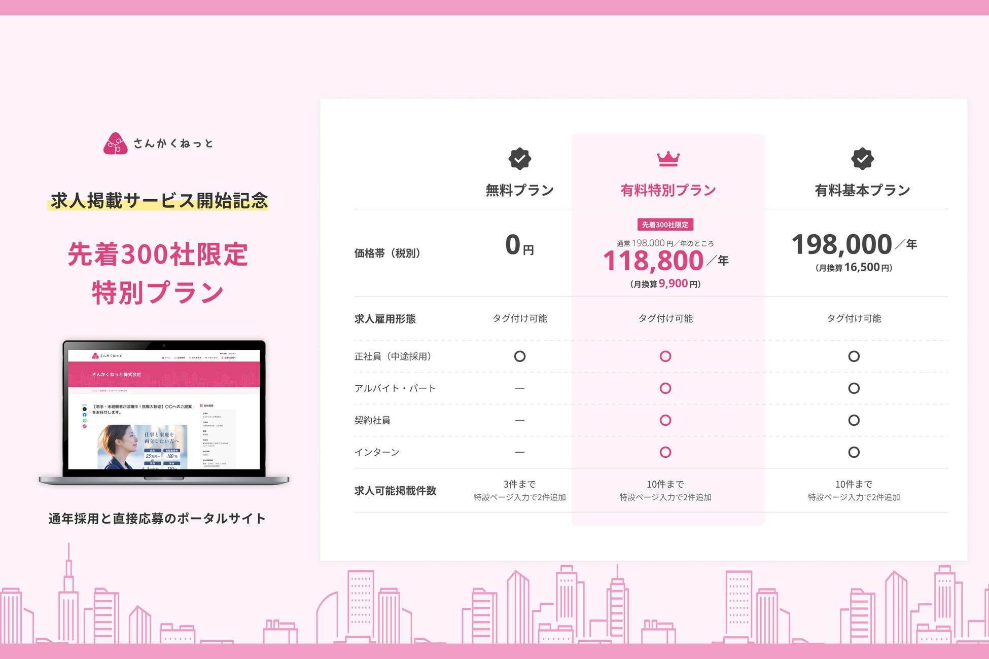 通年採用と直接応募のポータルサイト「さんかくねっと」を運営する、さんかくねっと株式会社(本社:東京都目黒区、代表取締役:内藤圭祐)は、「さんかくねっと」で2026年3月中旬より開始する求人掲載サービスについて、先着300社限定に特別プランをご提供することをお知らせいたします。