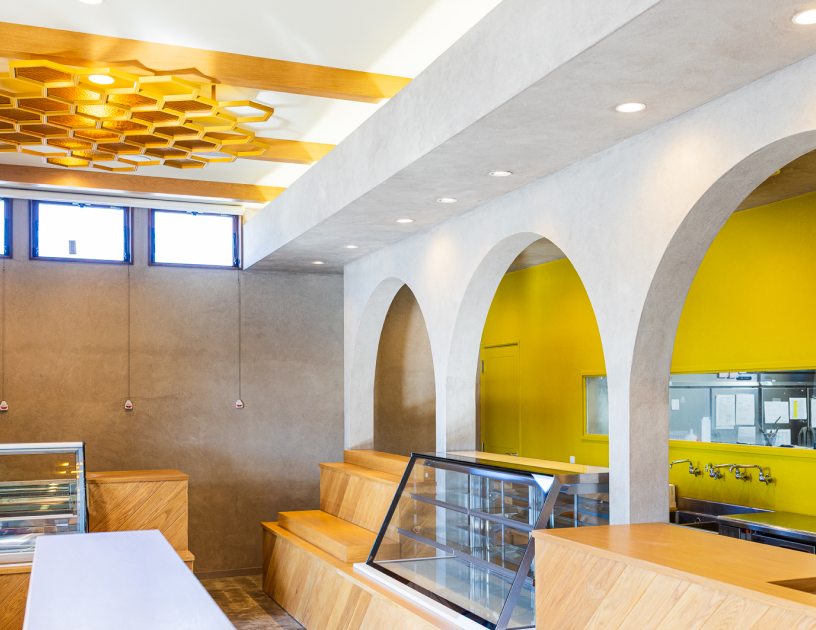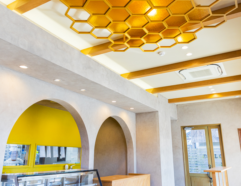 はちみつのパティスリー「スイーツアトリエ」としての世界観を、空間からも感じていただけるよう、内装をリニューアル。天井には、蜂の巣をモチーフにした六角形の意匠を取り入れ、はちみつを思わせる色合いと、やわらかな光の広がりを演出しました。アーチ状の壁や、奥行きを感じる構成により、視線が自然に抜け、店内全体がやさしくつながる設計にしています。