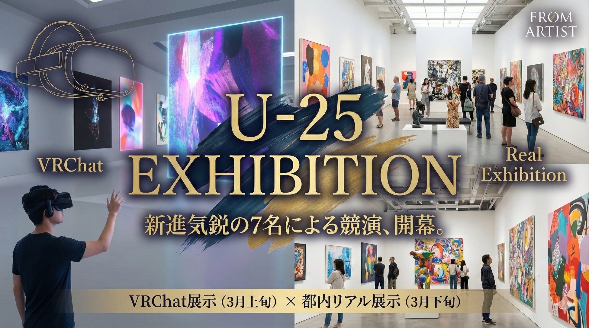 2)2026年3月上旬:VRChat展示会(バーチャル展示)開催 VRChat上で「U25エキシビション」を開催予定です。自宅からアクセスできるVR空間で、作品の世界観を体感しながら鑑賞できる展示体験を提供します。 ※会期・参加方法・ワールド情報は、特設ページおよび公式LINEにて告知します。