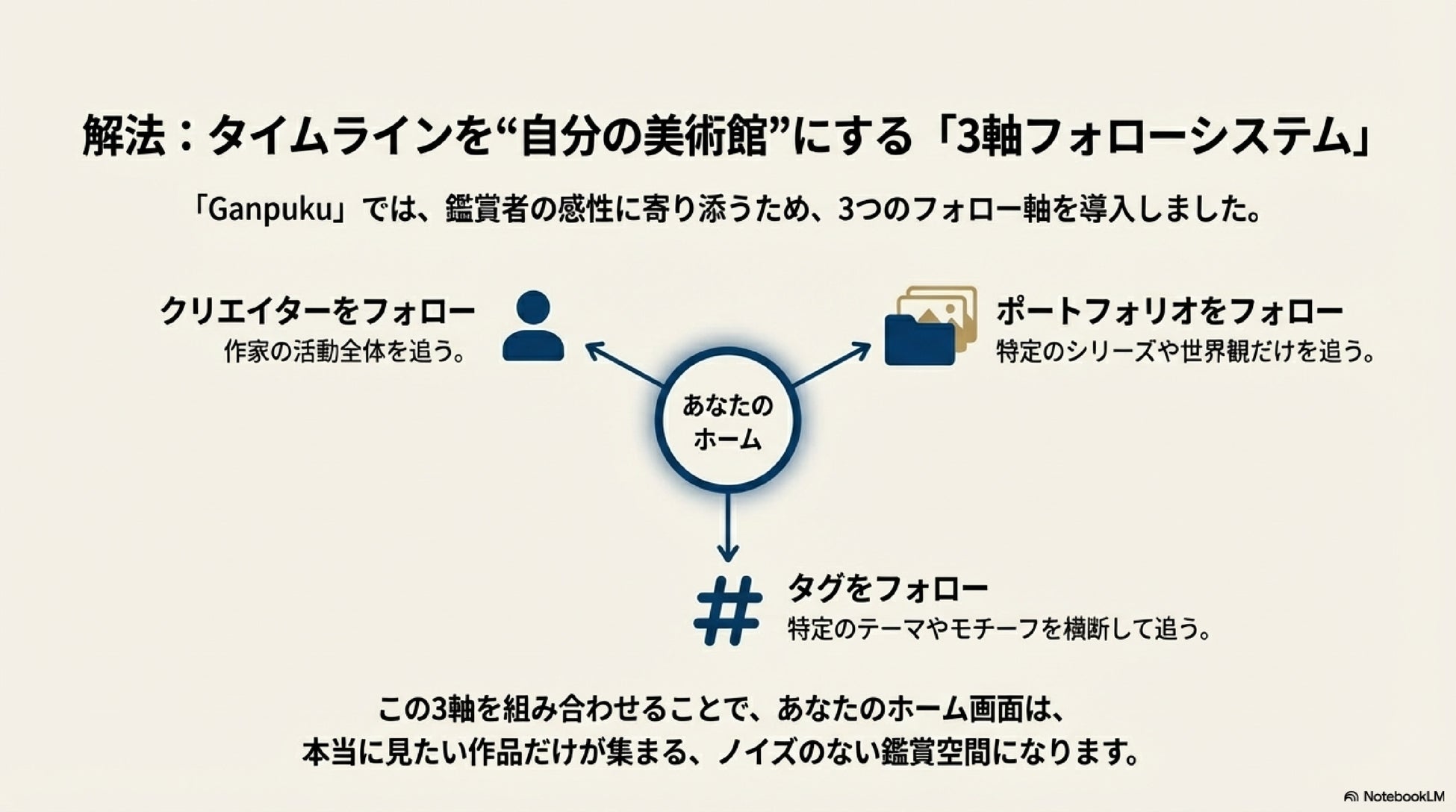 通常のSNSは「人(クリエイター)」をフォローするのが一般的ですが、「Ganpuku」では鑑賞者の好みに極限まで寄り添うため、3つのフォロー概念を導入しました。