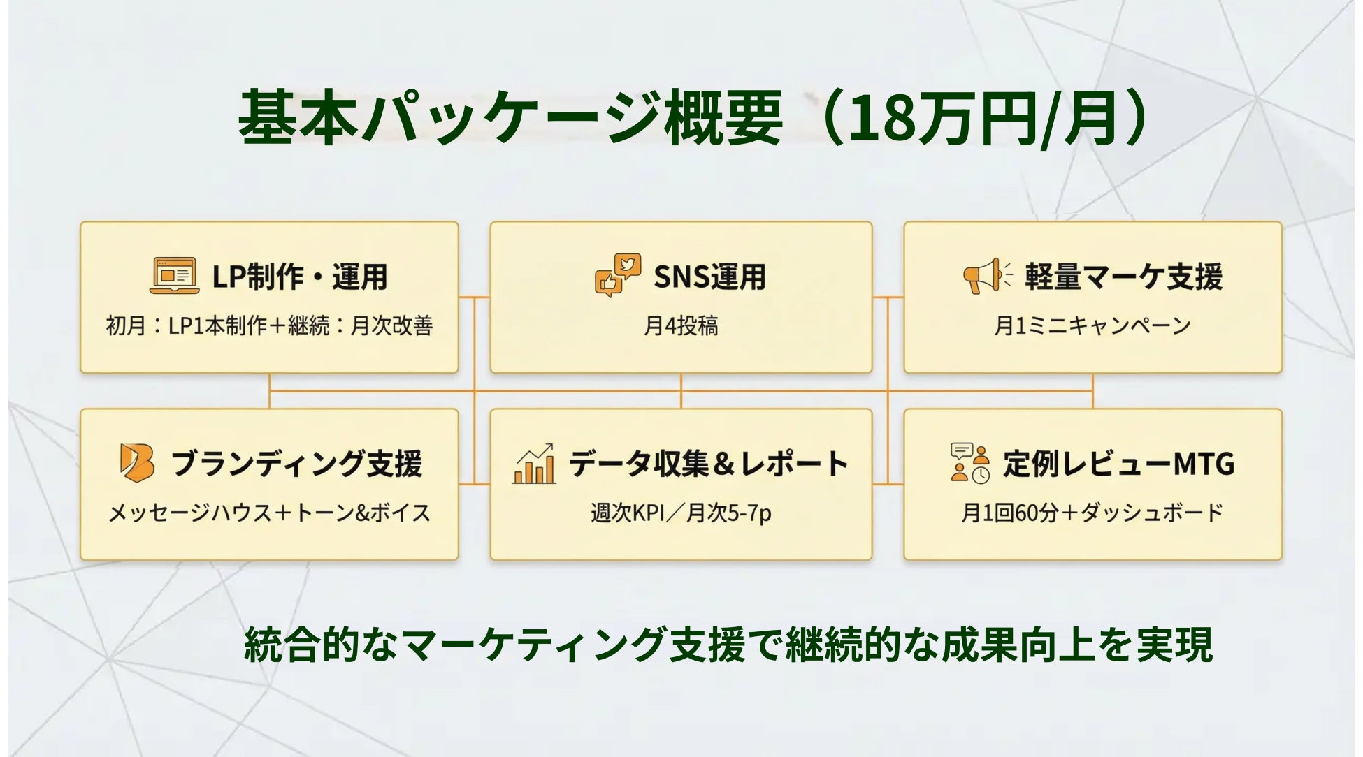 「予算の壁」を取り払い、月額18万円(税抜)〜という導入しやすい価格帯で、小規模事業者様でも効果を実感できるマーケティング活動を可能にします。