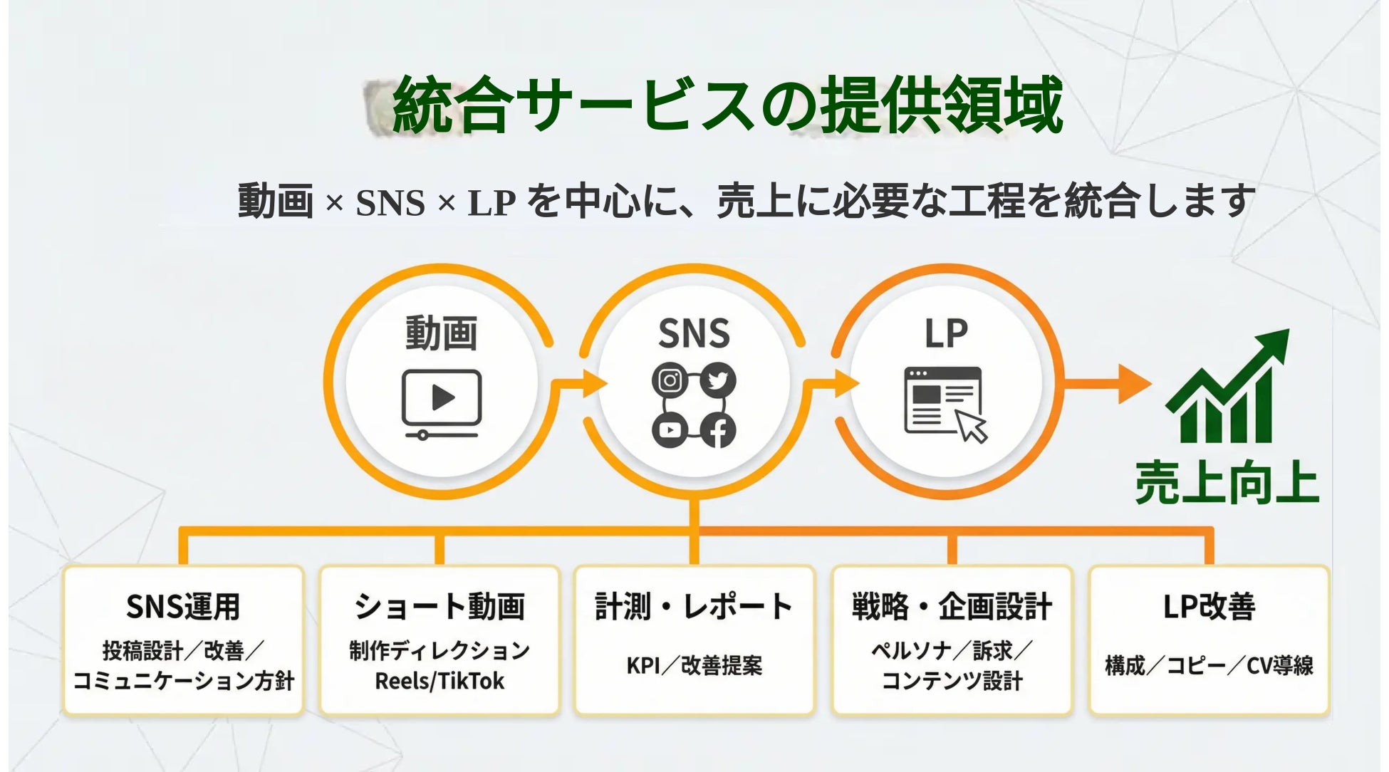 動画×SNS×LPを統合的に連携させることで、事業者様は本業に集中したまま、本格的なWebマーケティング体制を持つことができます。
