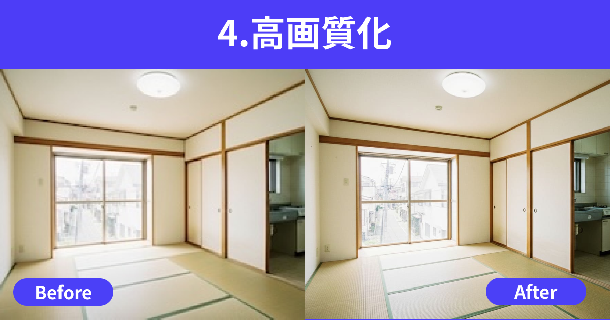前の住人の荷物や、古びた家具が写り込んだ写真から、指定した範囲をきれいに消去し「空室状態」に戻します。