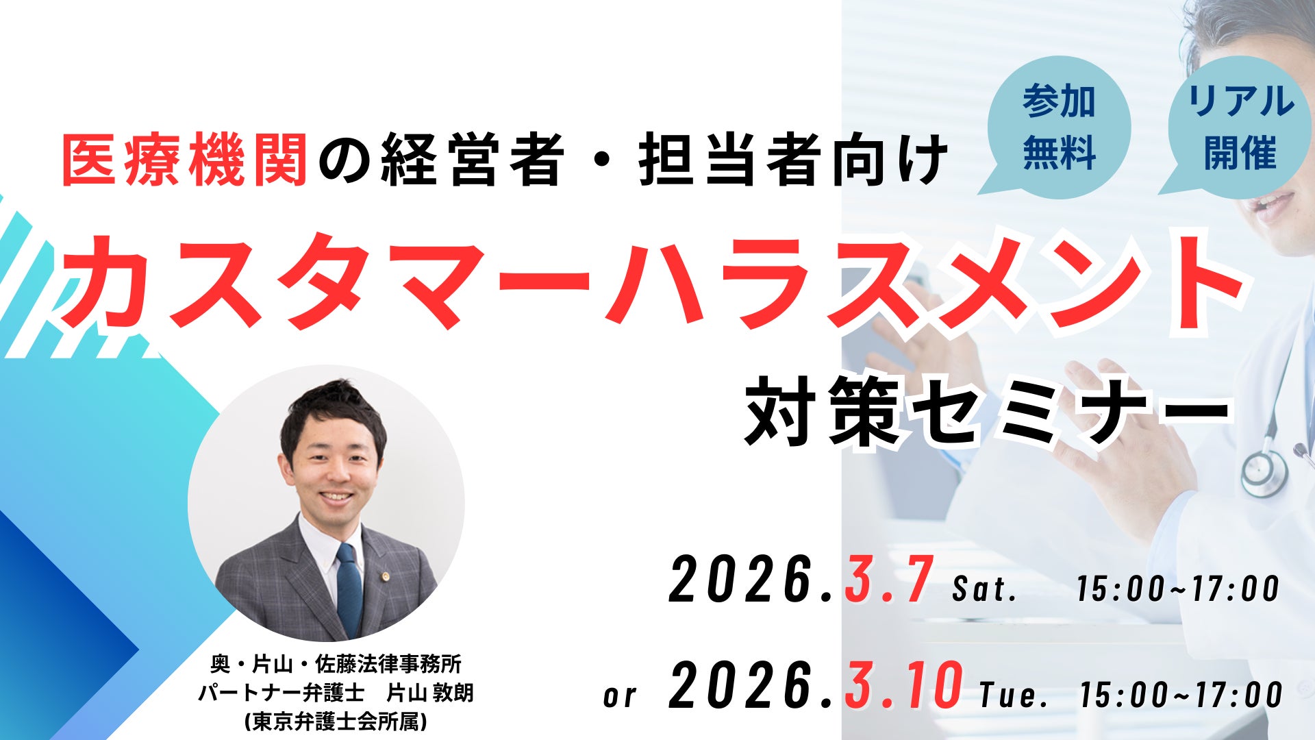 医療機関に特化した法律事務所が「医療機関向け カスタマーハラスメント対策セミナー」を無料・リアル開催にて実施いたします。