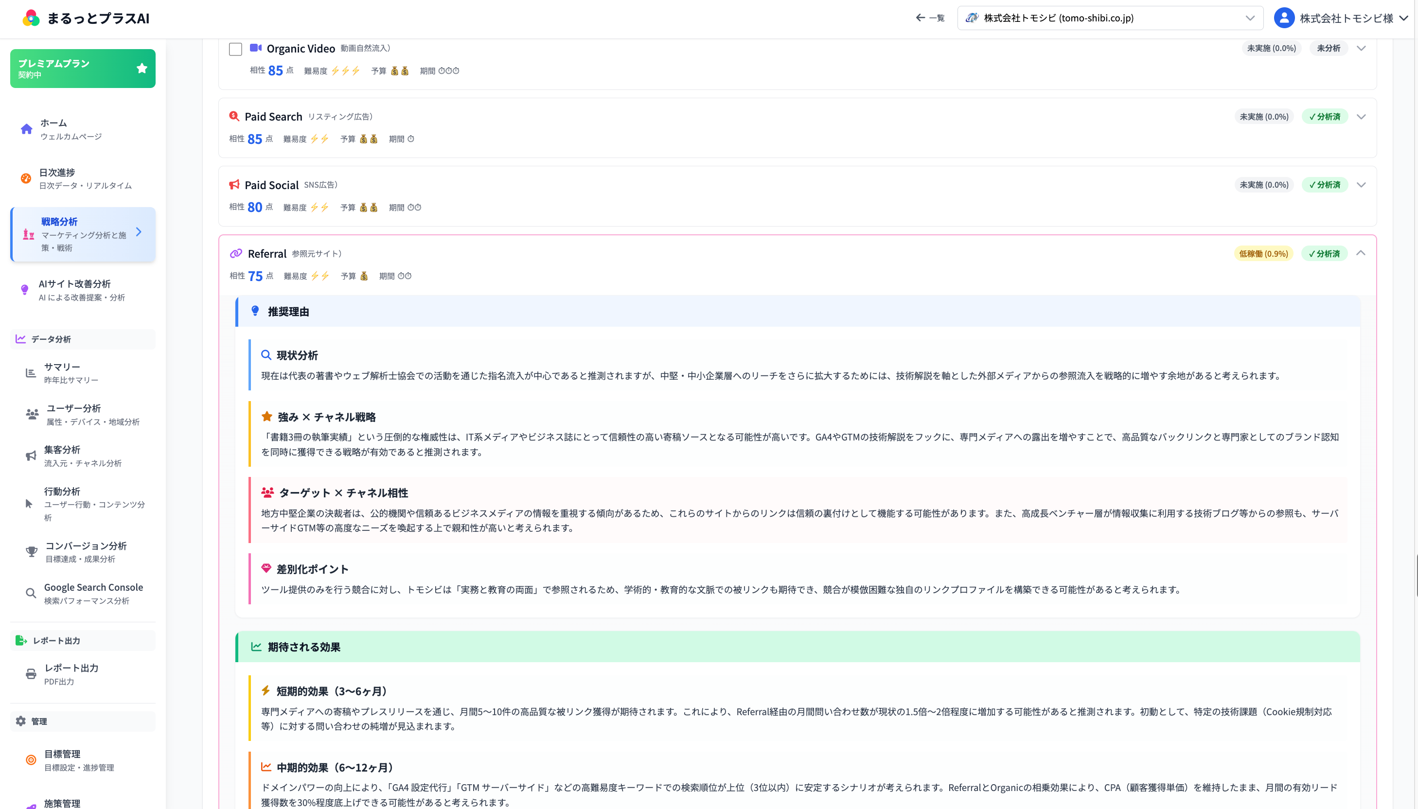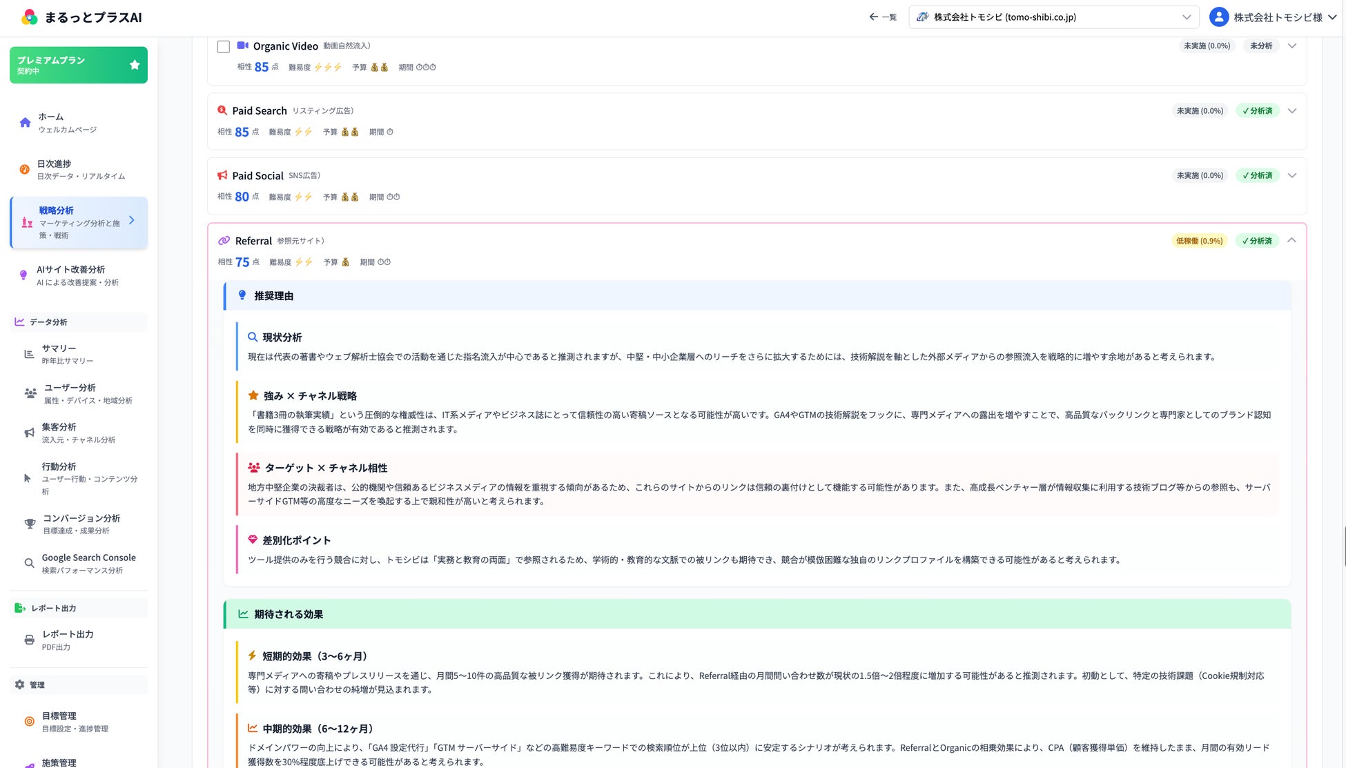 自然検索・リスティング広告・SNS広告・ディスプレイ広告など全18チャネルに対応した具体的施策を自動提案。優先順位付きの6ヶ月実施タイムラインも自動作成します。