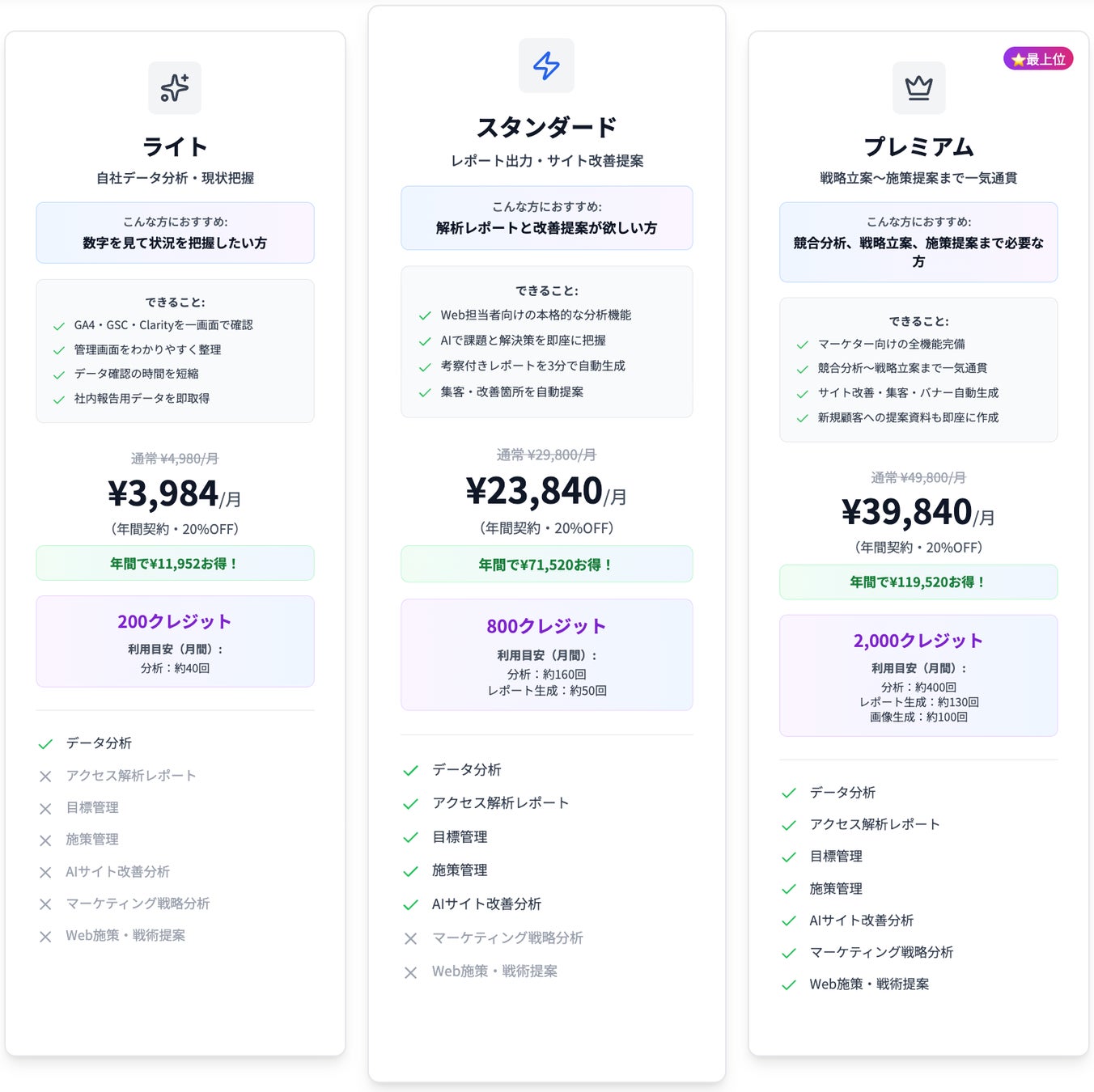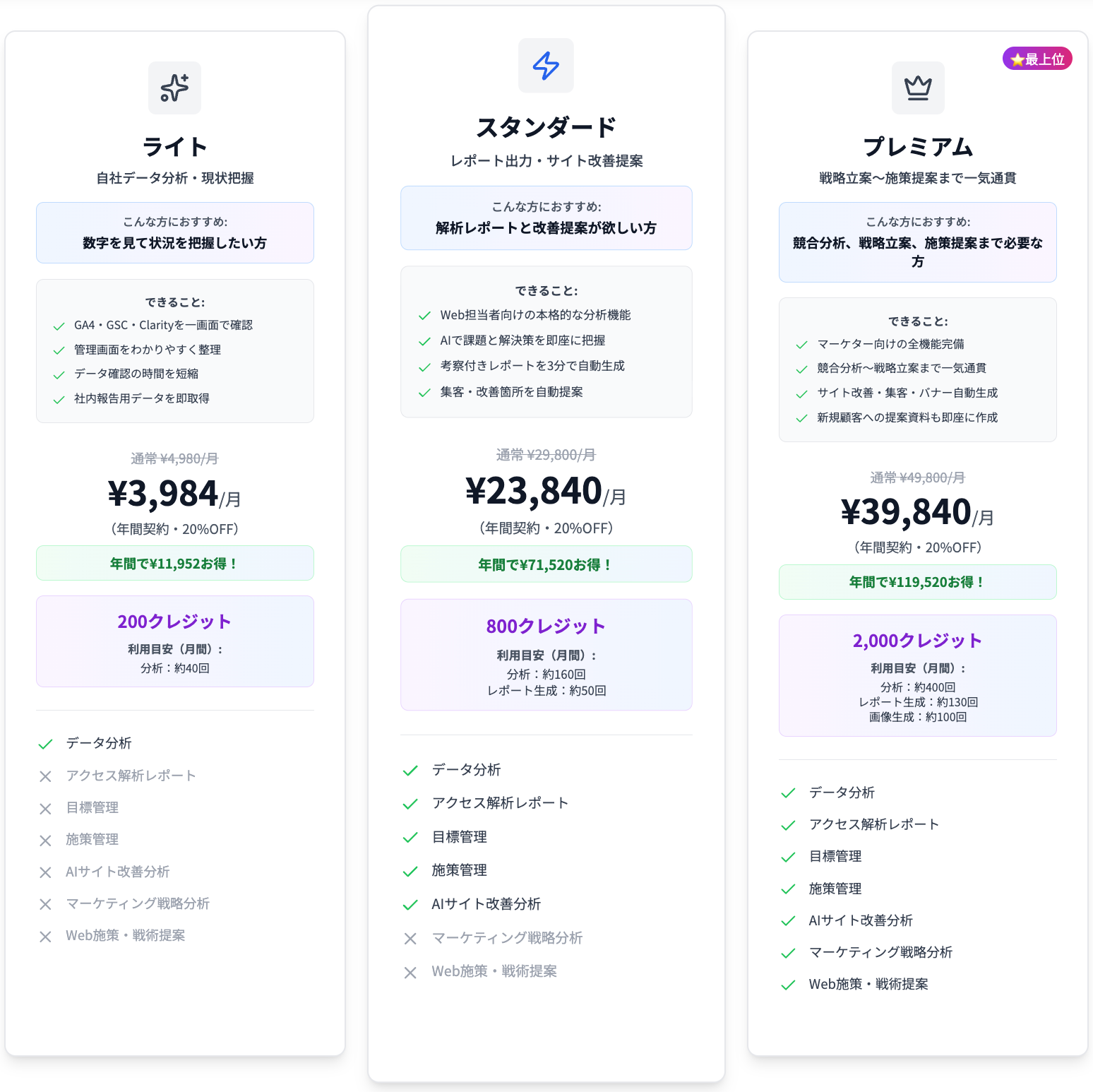 「分析レポート作成に毎月30時間かかっている」「Googleアナリティクス・Googleサーチコンソール・Microsoft Clarityの3つのツールを横断して分析するだけで時間が消える」「戦略を立てようとしても、どこから手をつければいいかわからない」——。