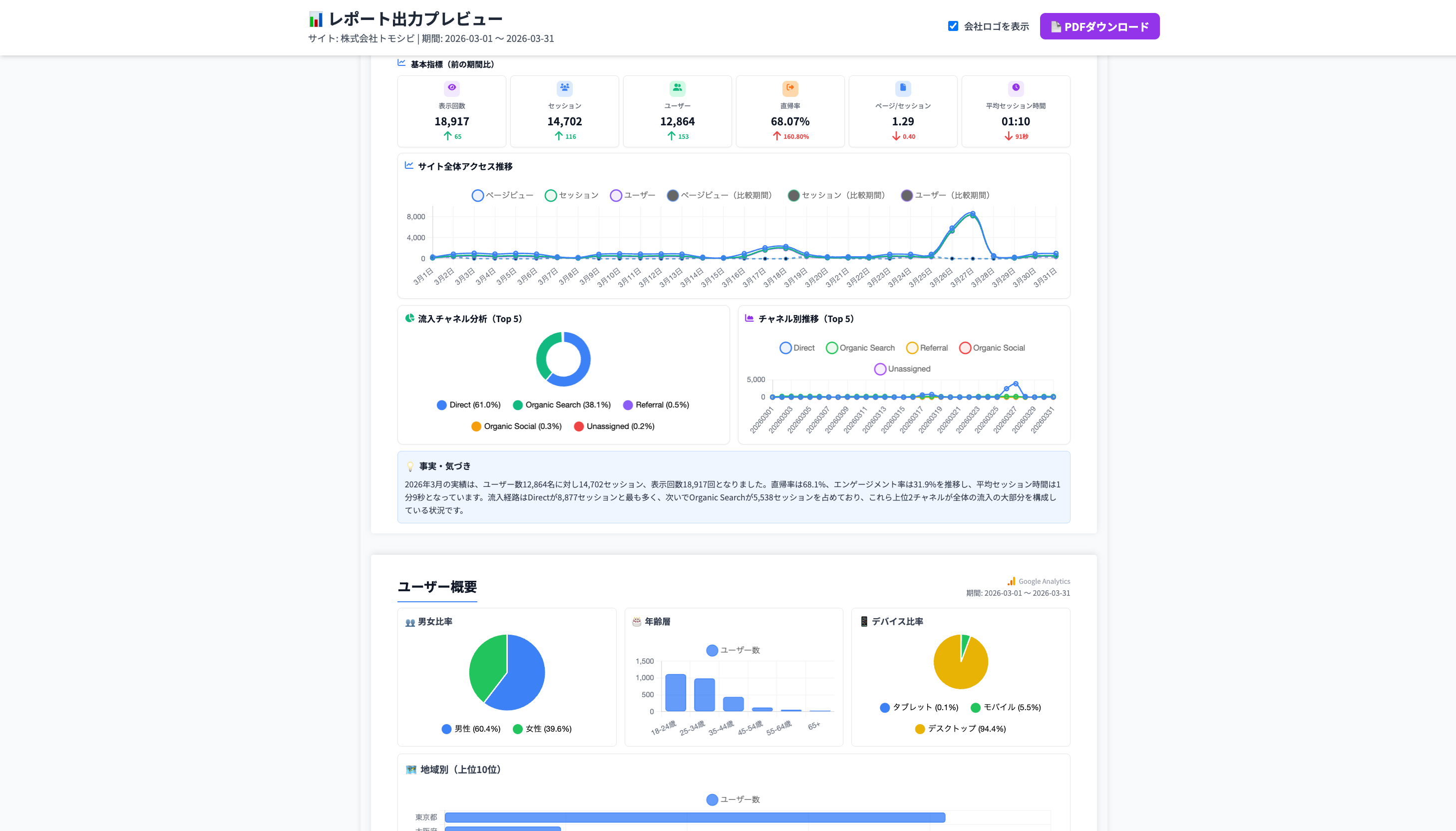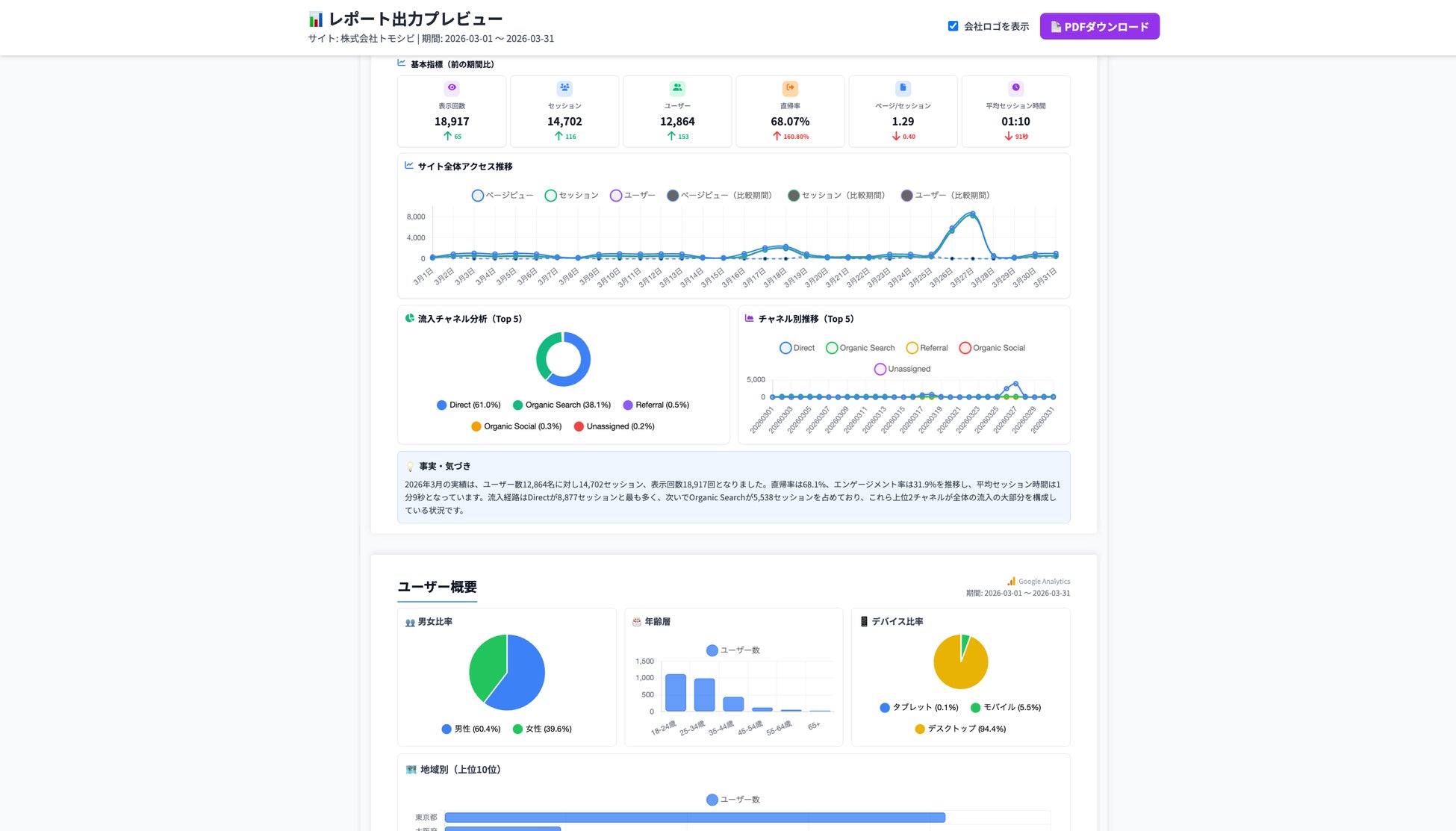 全27ページの網羅的な分析レポートを、AIの考察付きでワンクリック生成。自社ロゴの掲載にも対応しており、代理店の方も自社レポートとしてそのままクライアントに提出できます。