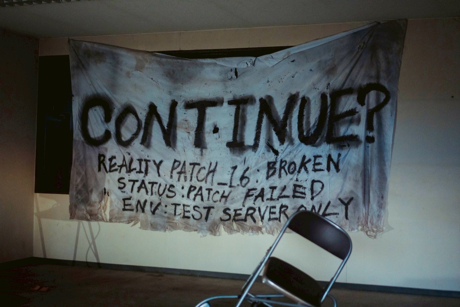 廃墟の建物内を中心に、視界をかすめるノイズ、無機質な表示、微細なズレが積み重なり、