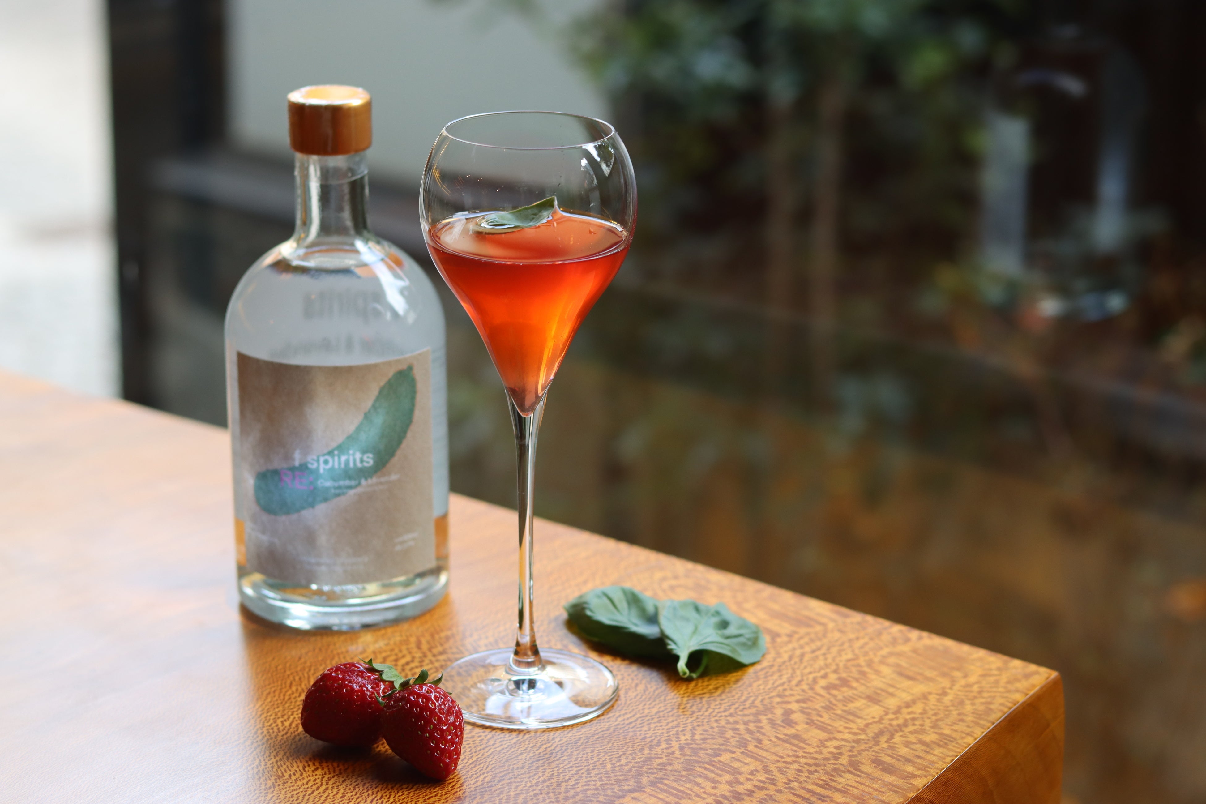 八焼酎・梅酒、ココナッツウォーター、フレッシュないちごを真空パックし、50℃で3時間低温抽出するミクソロジー技法を用いたカクテルです。仕上げにバジルを添え、奥行きのある香りを演出しています。