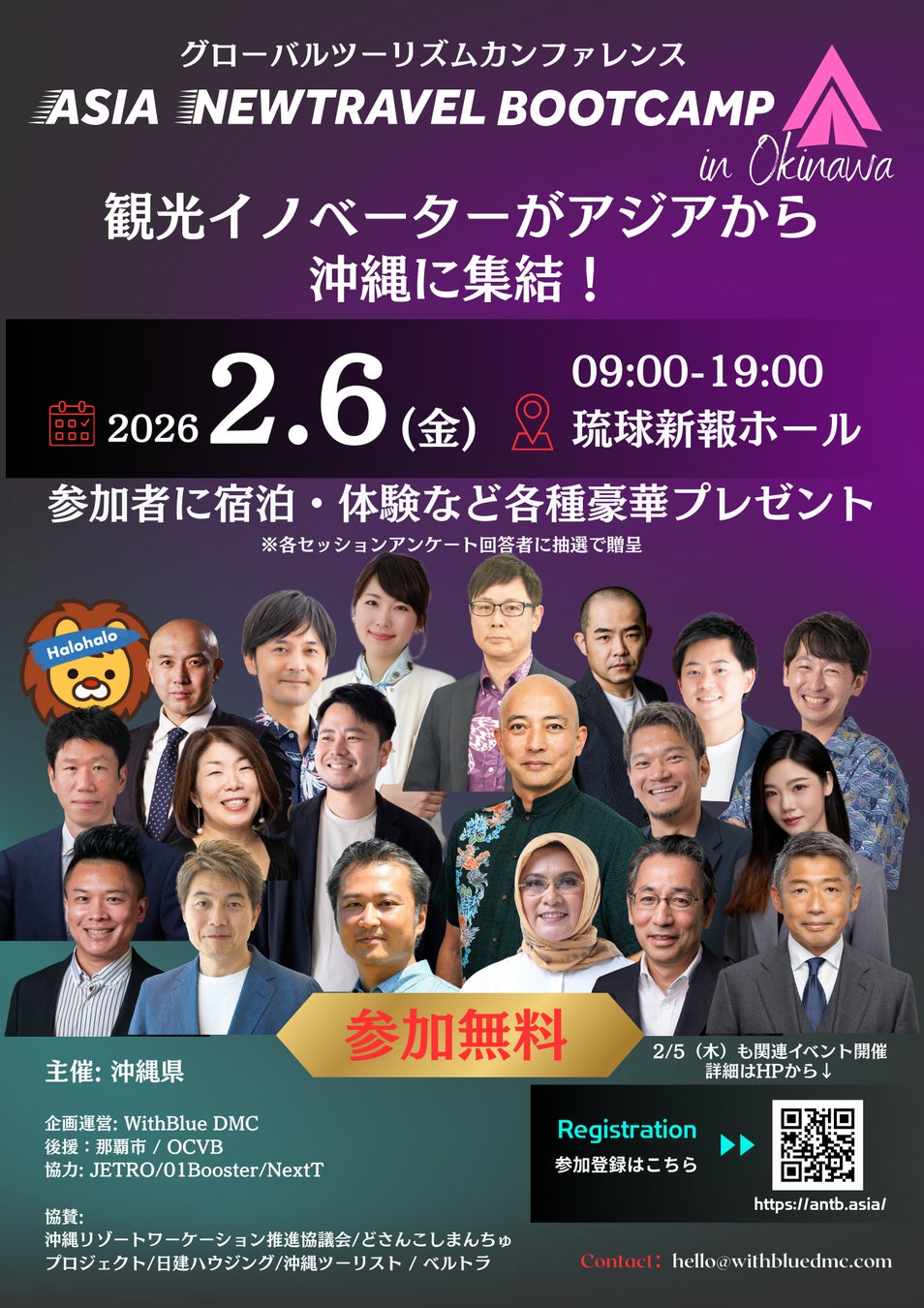 観光事業プロデュースやMICE運営、観光業界におけるオープンイノベーションを支援する株式会社WithblueDMC(本社:沖縄県沖縄市、代表取締役:伍香秀真)は、沖縄県より受託・運営するグローバルツーリズムカンファレンス「Asia Newtravel Bootcamp 2026」を2026年2月6日(金)に沖縄県那覇市の琉球新報ホールにて開催いたします。