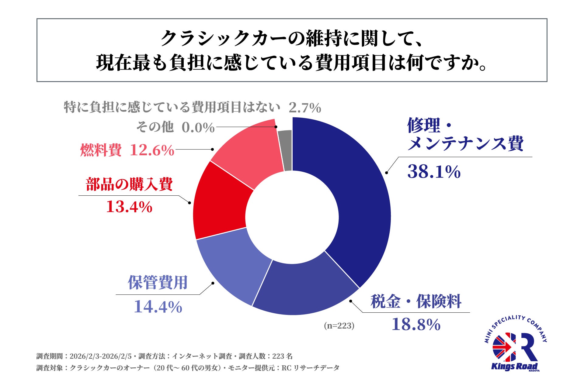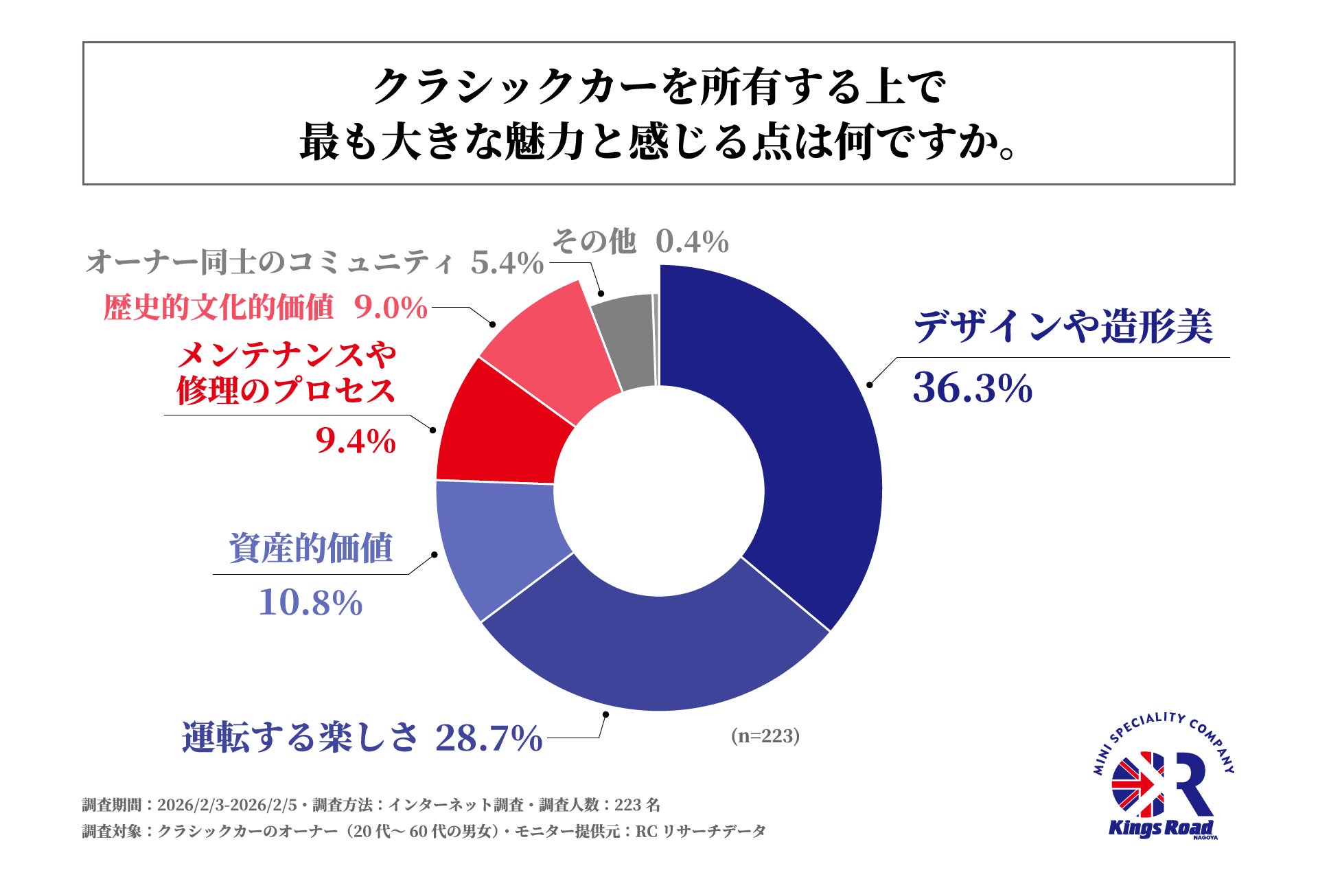 自動車産業は現在、100年に一度と言われる変革期の只中にあります。カーボンニュートラルの実現に向けたEV(電気自動車)シフトが進み、移動の利便性や効率性が極限まで追求される一方で、あえて数十年前に製造されたクラシックカーを選択し、日常を共にする人々が今なお存在しています。昨今のガソリン代や部品代の高騰、さらには環境意識の変化など、オーナーを取り巻く環境はかつてないほど厳しさを増しています。こうした社会的変化や経済的負担がある中で、なぜ彼らはあえてクラシックカーという選択をし続けているのか。そこには、現代社会における「車」という存在への、新たな価値観や視点があるのかもしれません。現代においてクラシックカーを所有する価値や課題、そして社会的な意義について、その実態を深く掘り下げた調査はこれまで多くありませんでした。そこで、有限会社キングスロードはクラシックカーオーナーを対象に「EV車時代におけるクラシックカーの魅力に関する調査」を実施しました。