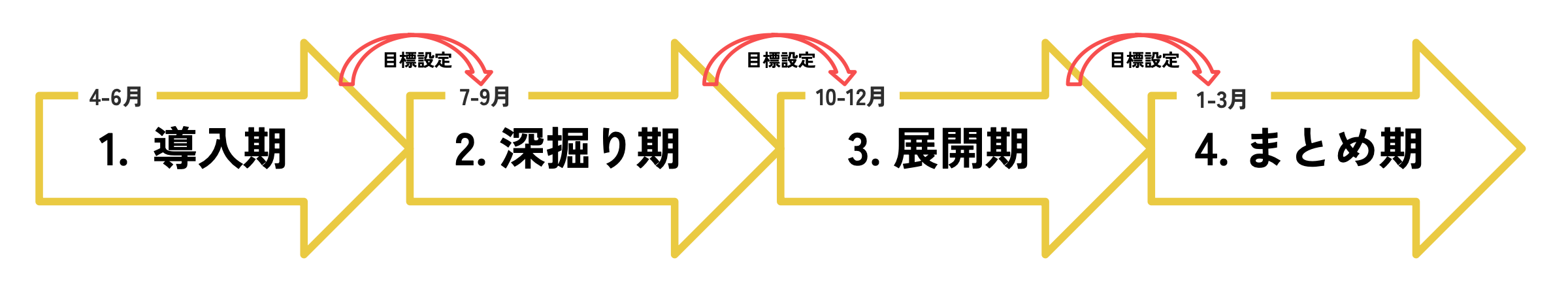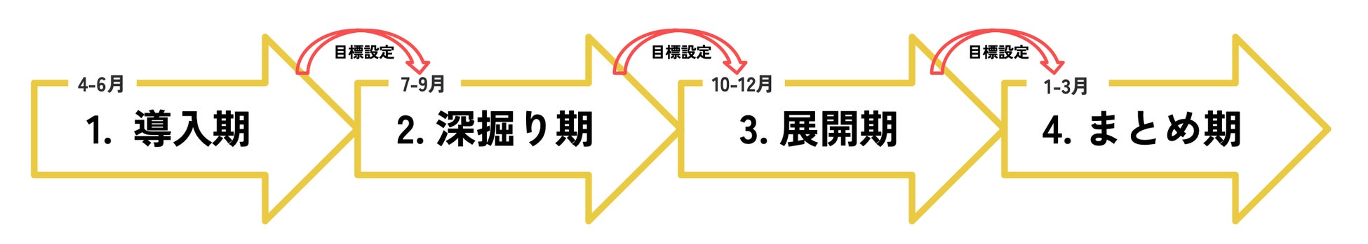 登竜門プロジェクトでは、年間を通じた4つのフェーズで構成される継続的な育成プログラムを通じ、初学者から中級者へのステップアップを支援し、縦(先輩・後輩)と横(同期)のつながりを生み出す成長コミュニティの構築を目指します。